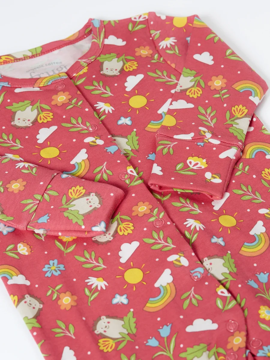 Babypyjamas från Frugi i underbart mjuk bomull med sött tryck med glada igelkottar. Pyjamasen har flera små detaljer som gör den mycket praktisk. Den knäpps med tryckknappar ner på båda benen för att underlätta på- och avklädning. Storlekar upp till 74/80 har nedvikbara muddar som fungerar som integrerade vantar och håller bebisens händer varma och förhindrar att de råkar riva sig. Pyjamasen har också fötter i dubbelt tyg för att hålla fötterna varma och för ökad slitstyrka.