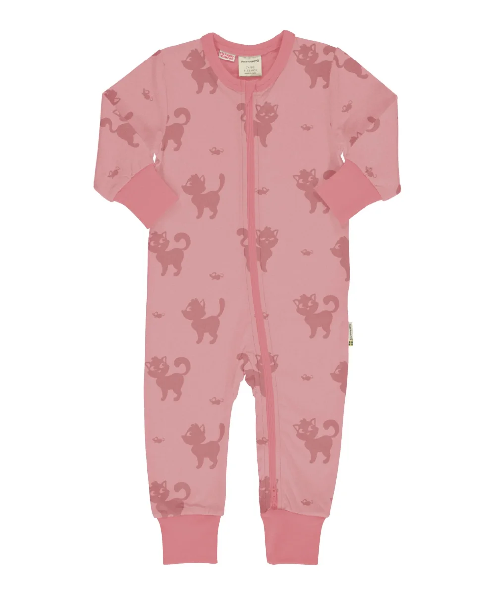 Babypyjamas i mjuk ekologisk bomull med sött kattmönster. Blixtlås ner i ena benet för snabb och enkel på- och avklädning.