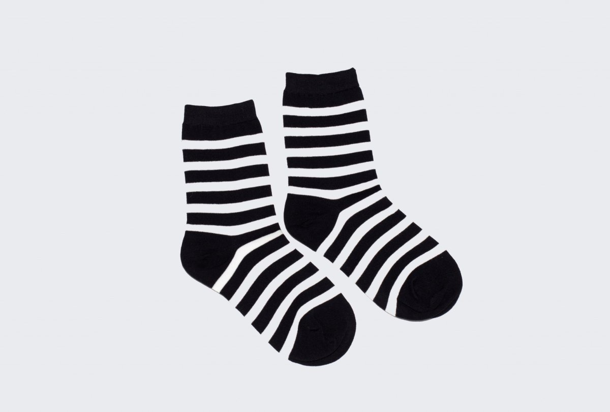 Blå- och vitrandig bambustrumpa med 80 % bambufiber, 15 % polyester och 5 % elastan. Extra förstärkt mot slitage i såväl häl som tåspets.