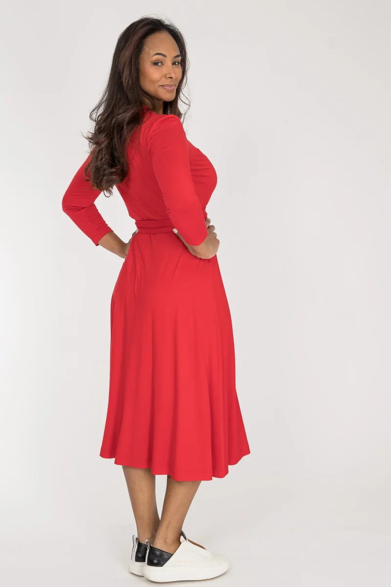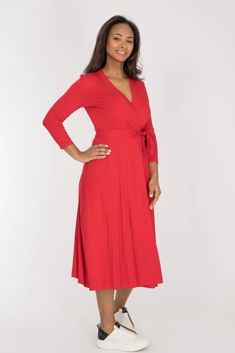 Omlottklänningen är sydd i en trikå av viskos och elastan. Tyget är mjukt och följsamt, nopprar inte och håller både formen och färgen tvätt efter tvätt. Kort sagt – en klänning att bära ofta och länge.