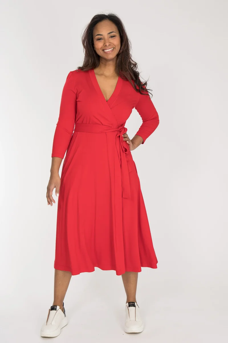 Vi har en förkärlek för omlottklänningar, de är lika smickrande som bekväma. Här är en vadlång modell i mjuk trikå med knyt i midjan och vidd i kjolen. Bestie wrap dress återkommer i kollektionen år efter år och är en av våra mest älskade klänningar.