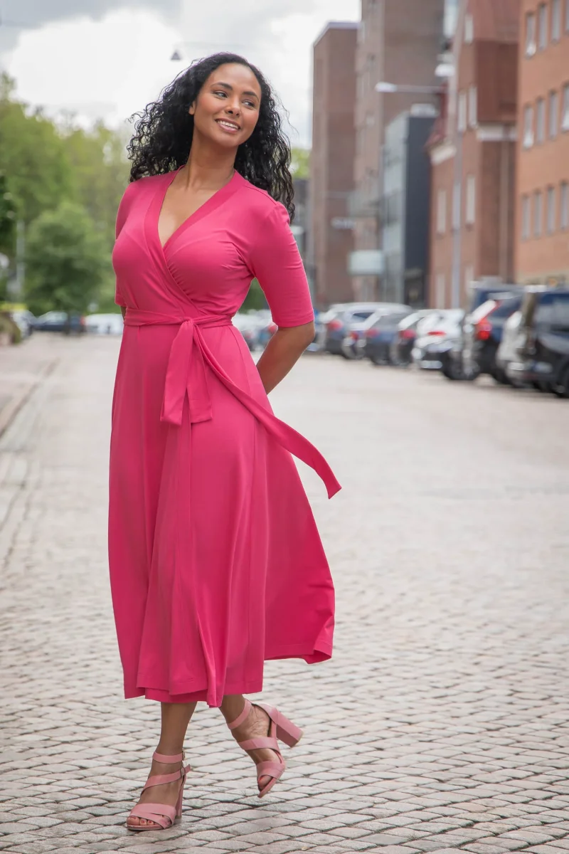 Omlottklänningen är sydd i en stretchig trikå med viskos och elastan med ett tungt fall. Kvalitén är mjuk, följsam, nopprar inte och håller både formen och färg tvätt efter tvätt. Med andra ord – här har du en klänning gjort för att användas mycket (och länge)