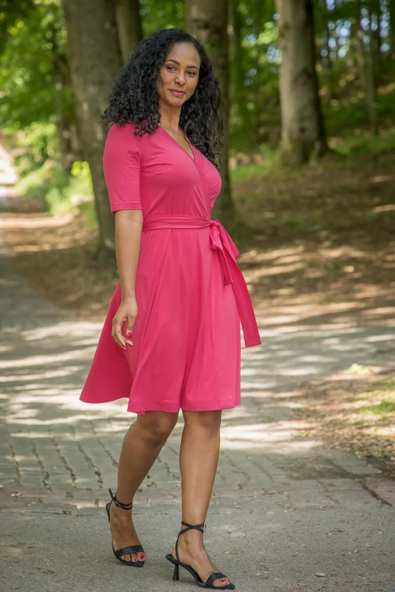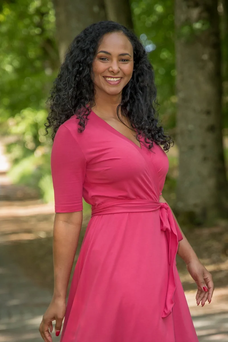 Omlottklänningar har en särskild plats i våra hjärtan, då de kombinerar smickrande siluetter med överlägsen komfort. Här är vår knälånga modell, sydd i stretchig trikå med knyt i midjan och vidd i kjolen. Bestie wrap dress återkommer i vår kollektion och är en av våra mest omtyckta klänningar.