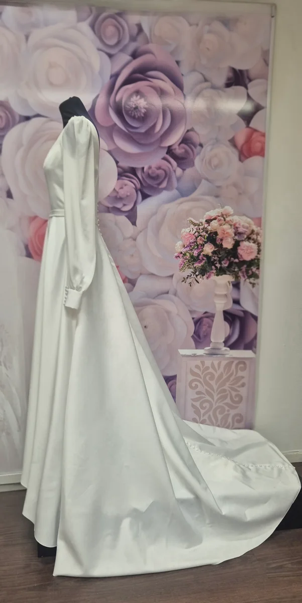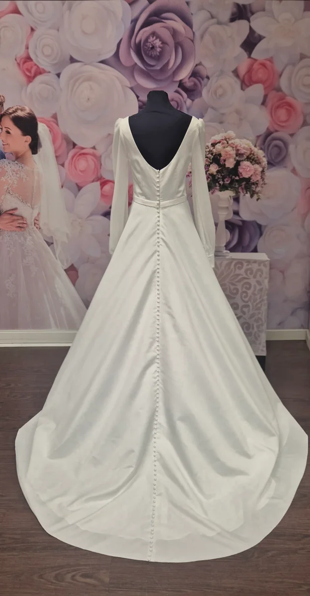 Långärmad och golvlång med ett svepande släp som ger en romantisk känsla. Mjuk fyrkantig urringning. Figurnära liv med en subtil markerad midja, med ett skärp i samma material. V-ringad djup rygg samt klädda knappar hela vägen ut på det vackra släpet.