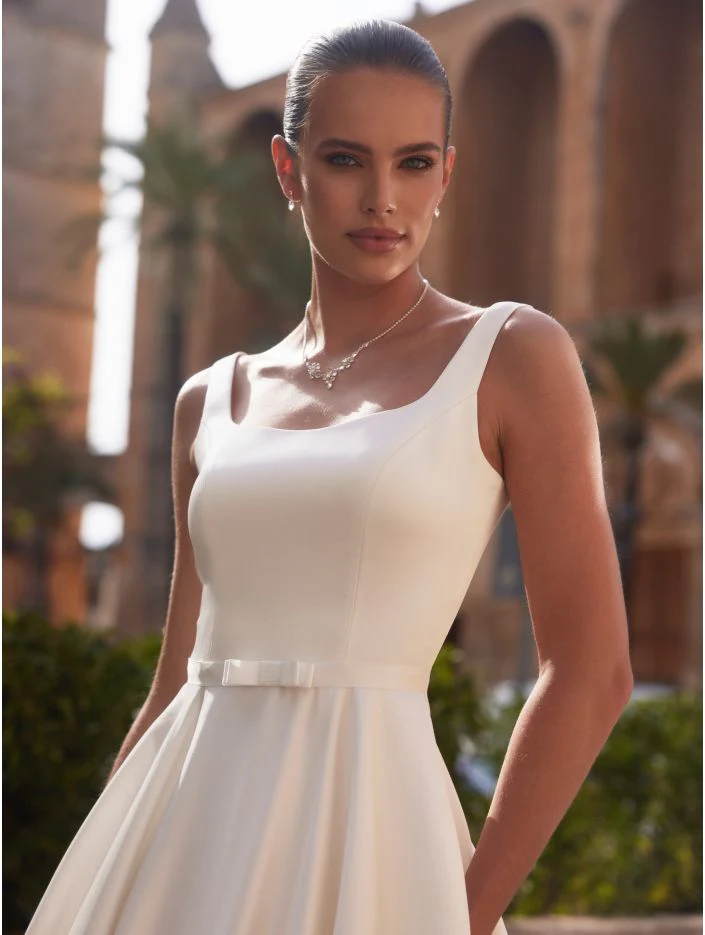 Levente är en elegant A-linjeformad brudklänning tillverkad i högkvalitativt mikadotyg. Klänningen har ett imponerande släp som ger en känsla av storslagenhet, med en sofistikerad fyrkantig halsringning både fram och bak, samt en naturlig midja. Den ärmlösa siluetten framhävs av ett stiligt bälte prytt med en rosett.