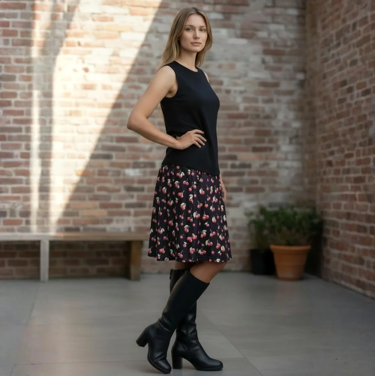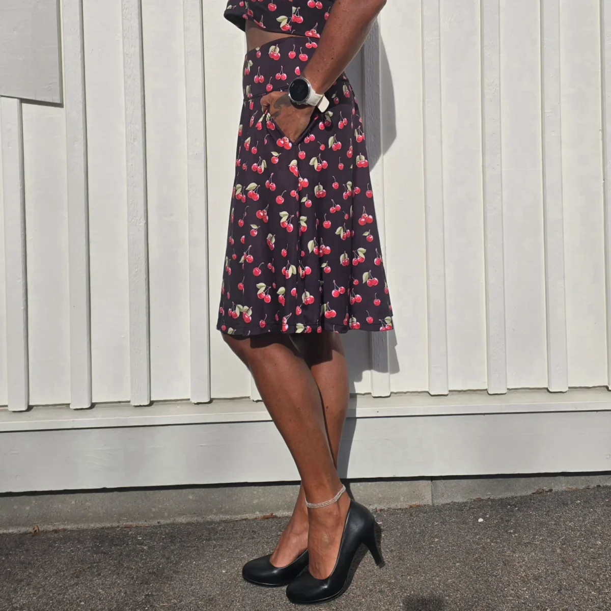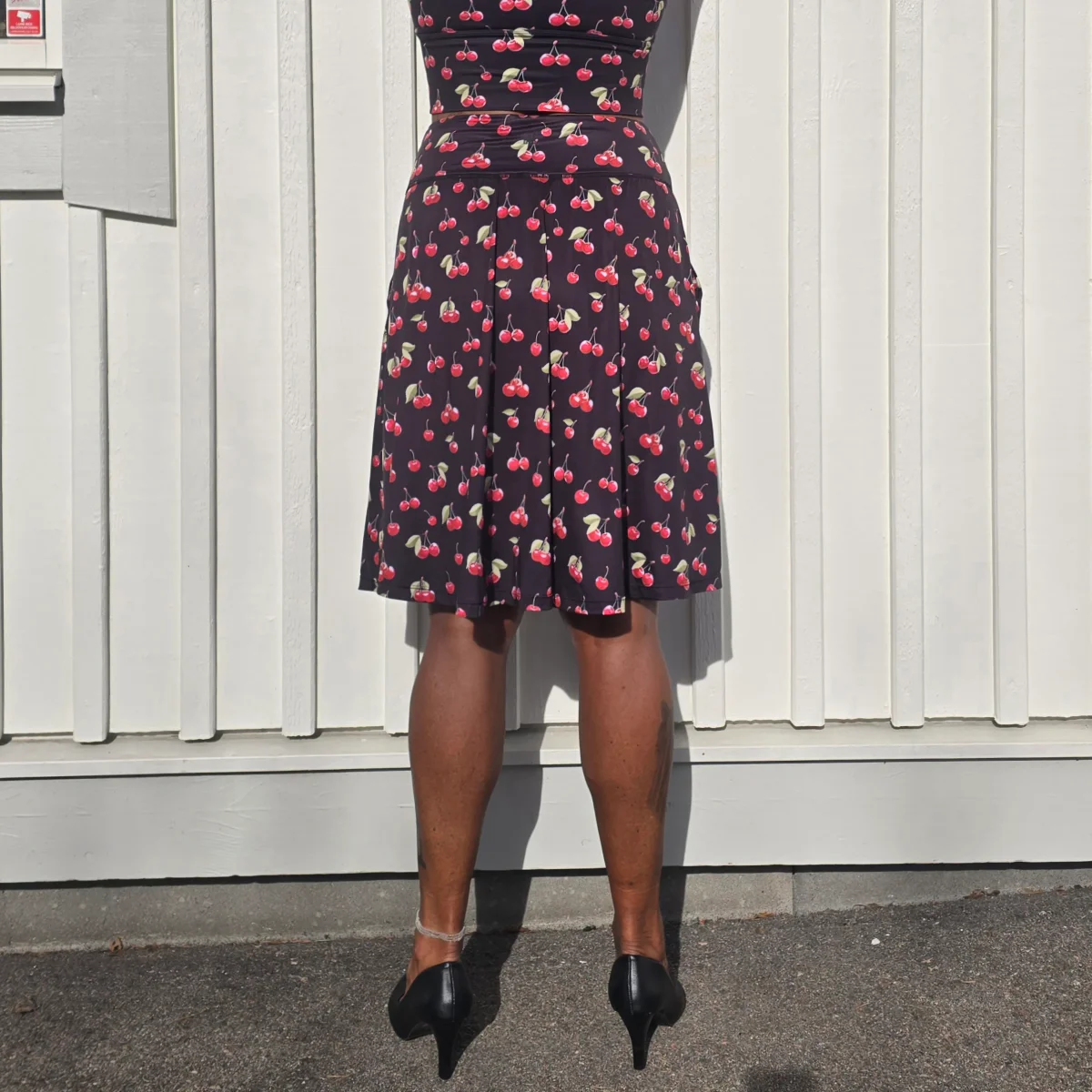 Svart knälång byxkjol med körsbärsmönster i tunnare tyg med ett otroligt fint fall. Skapad för en skön vardag och en aktiv livsstil. Den här byxkjolen har två vanliga handfickor på utsidan för förvaring av nycklar, mobil och exempelvis bollar och andra tillbehör om du spelar golf. Den har hög midja och två mobilfickor på innershortsen. Innershortsens storlek är uppdaterad för en bättre passform. Kjolen är skapad för en aktiv livsstil och passar lika bra för vardag, golf och fest.