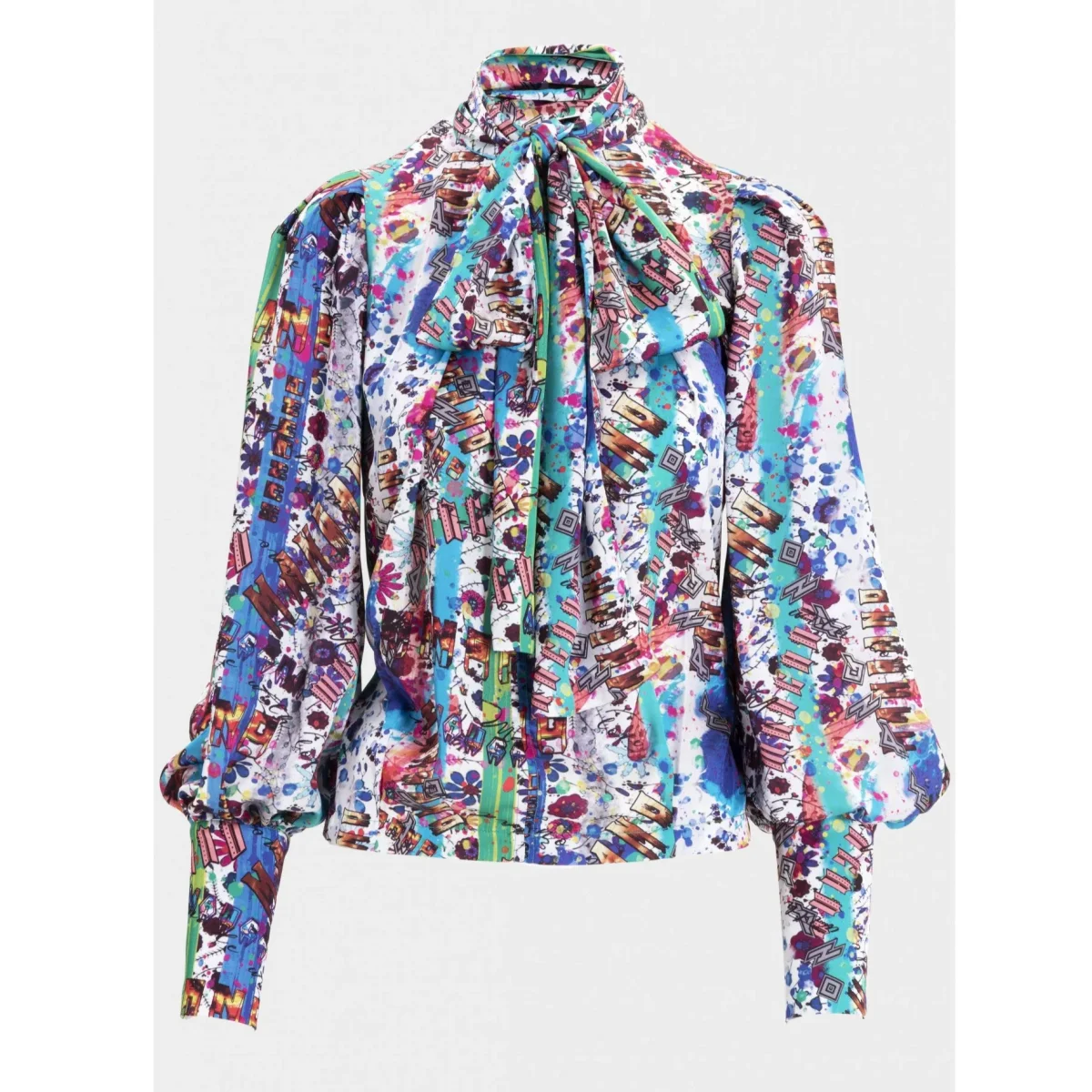 Satinblus med exklusivt ”Mangano Graffiti” -tryck. Stort knytband kring halsen och breda puffärmar.