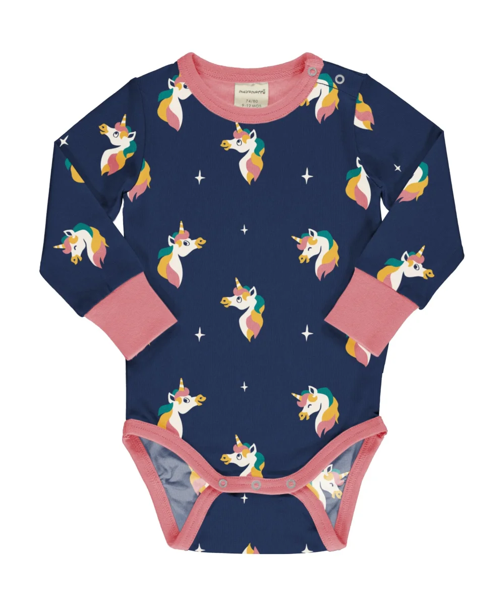 Härligt färgglad body med fint tryck med enhörningar i mjuk och skön ekologisk bomull. Knäppning på ena axeln. Muddar i matchande färg.