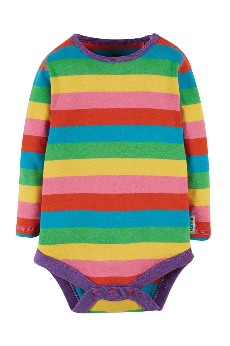 Härligt färgglad body från Frugi i supermjuk ekologisk bomull. Storlekar upp till 62/68 har tryckknappar på båda axlarna, från storlek 68/80 på ena axeln.