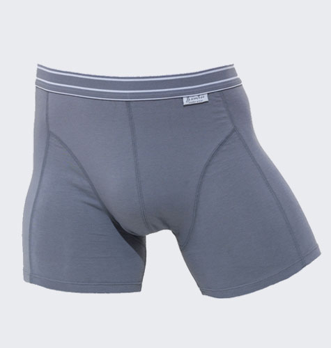Gråa boxershorts i bambu för män i 95 % bambufiber och 5 % elastan. Extra förstärkt mot slitage i grenen.