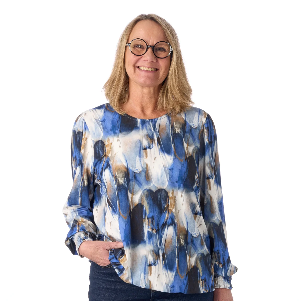 Precis som i vår populära Sara-blus har denna modell resår nedtill. Det gör att blusen håller sig på plats och sitter fint hela dagen.