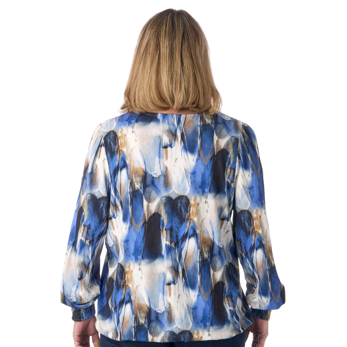 Mönstret kombinerar naturliga toner med inslag av blått. En fräsch men ändå lugn färgmix som är lätt att matcha med både byxor och kjol.