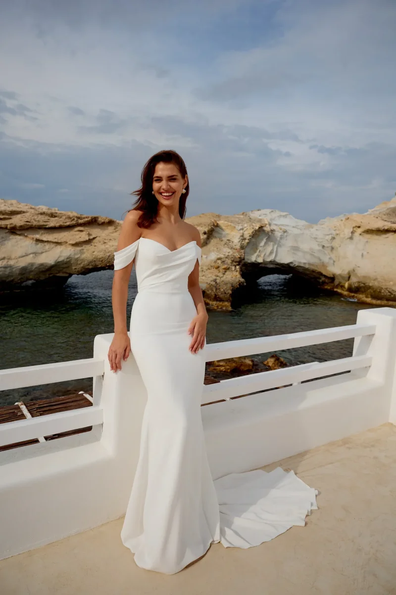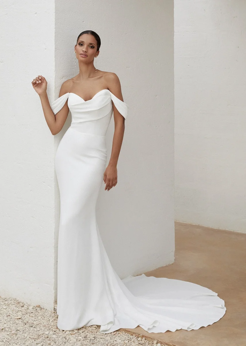 Crepeklänning med slank passform och utsvängd kjol, draperad hjärtformad urringning och avtagbara axelband. V-formad rygg detalj med klädda knappar och vackert släp. Fodrad med jersey som gör den mjuk och skön att bära.