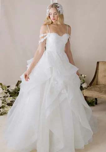 Den här brudklänningen är en dröm i vitt, skapad för att förmedla både elegans och romantik. Den har en figurnära livstycke med tunna axelband och vackra spetsdetaljer, ger ett luftigt och graciöst intryck. Kjolen är voluminös och består av flera lager mjuk tyll med böljande volanger som faller i ett vackert, kaskadliknande mönster.