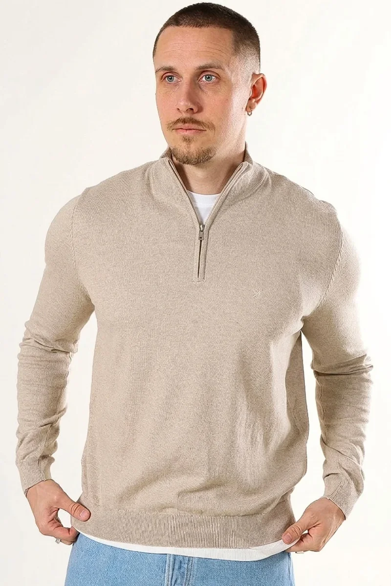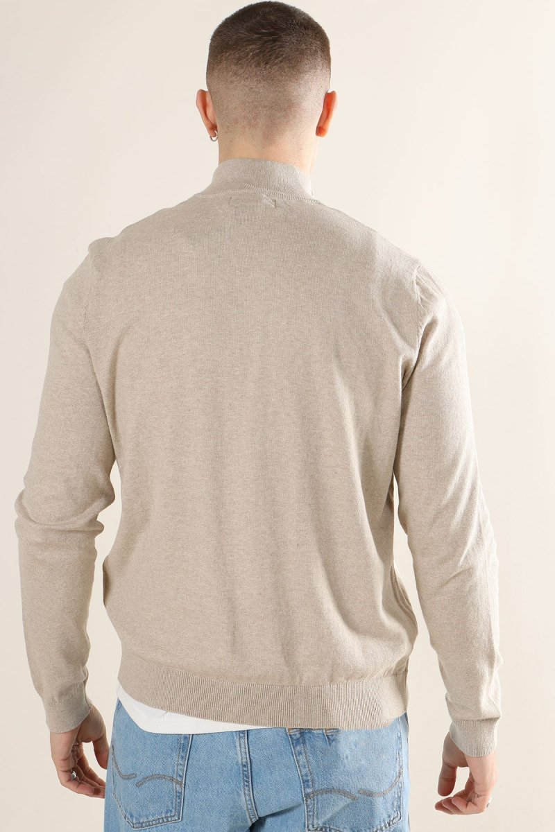 • Lättstickad tröja med hög hals och half zip.