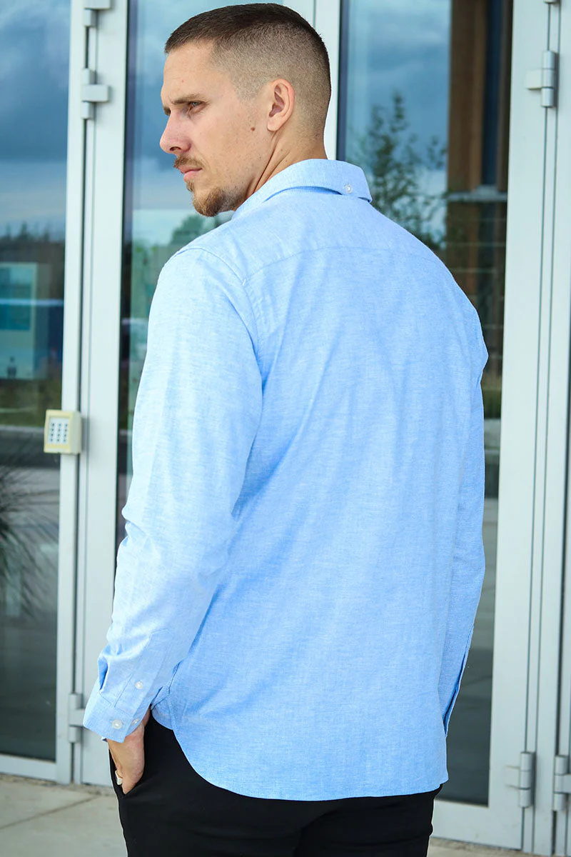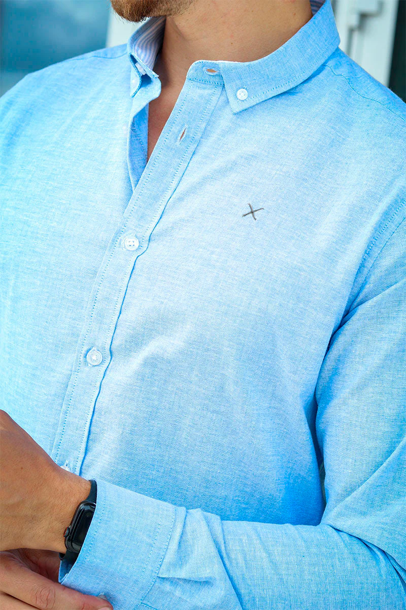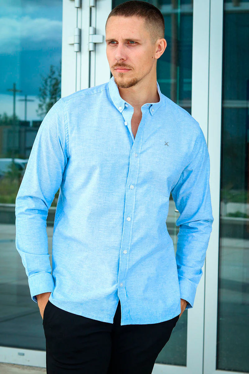 Den här skjortan har en klassisk Oxford-stil med lång ärm och en mjuk, stretchig passform som gör den bekväm hela dagen. Den ljusblå färgen gör den enkel att matcha med olika plagg, perfekt för hösten 2025. Materialkombinationen av bomull, polyester och spandex bidrar både till komfort och hållbarhet, samtidigt som tyget har en slät väv som ger ett stilrent utseende.