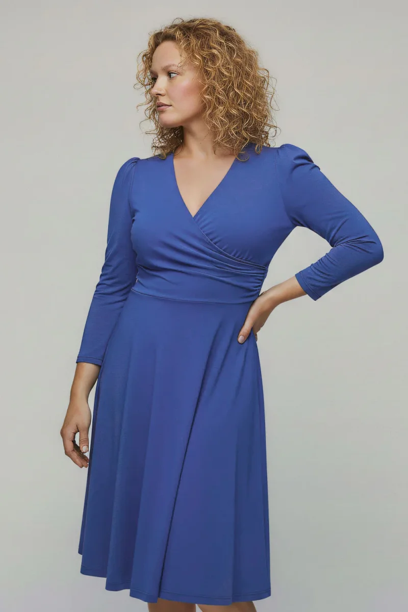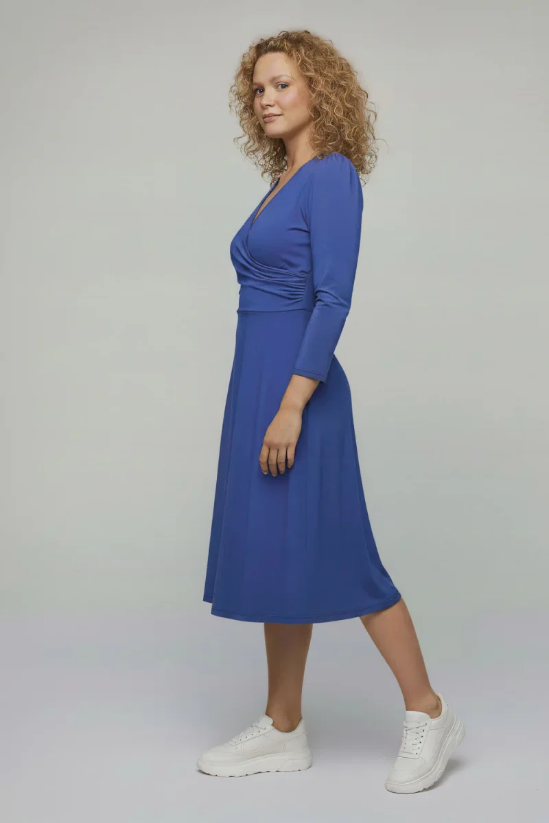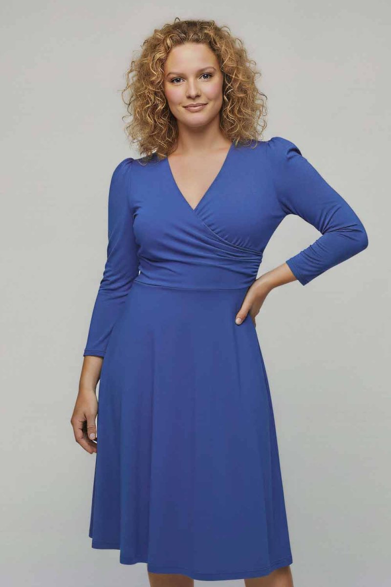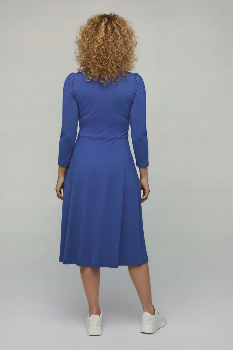 Klänningen har ¾-lång puffärm och kommer i enfärgad klarblå nyans. En bekväm men samtidigt genomarbetad modell som fungerar lika fint till vardags som till mer uppklädda tillfällen. Finns även i en kortare, knälång version.