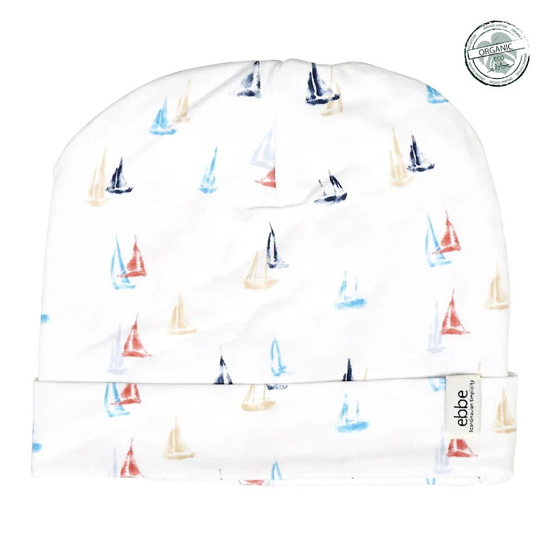 Trikåmössa till baby och barn tillverkad i mjuk slubtrikå av ekologisk bomull. Mössan är helmönstrad i ett fint tryck med små segelbåtar.