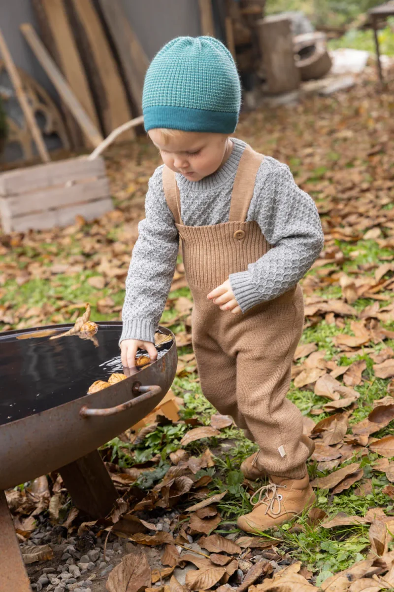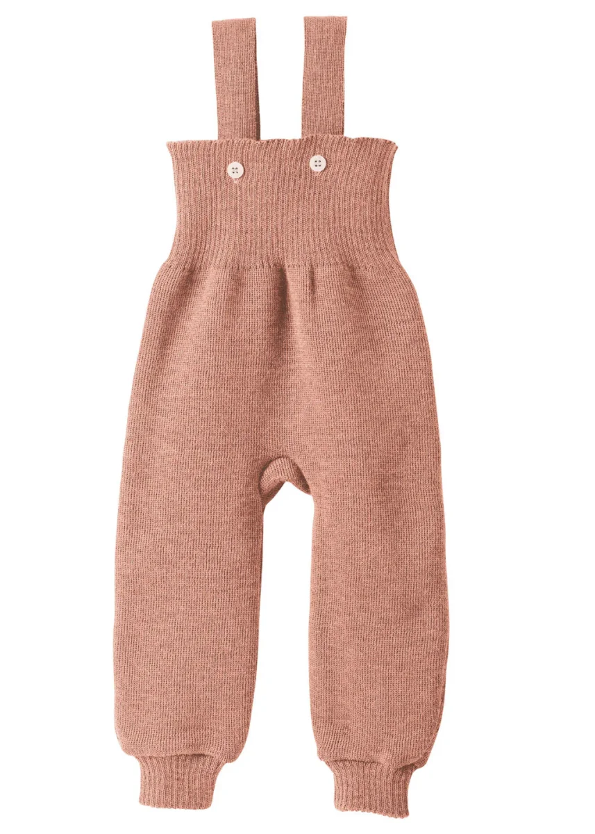 Underbara stickade yllebyxor som passar bra som ytterlager ute och även inomhus om det är kallt på golvet. Mycket följsamma och smidiga att röra sig i. Hängslena är avtagbara vilket gör att byxorna räcker mycket länge. Tillverkade i Tyskland i 100 % ekologisk ull från Argentina.