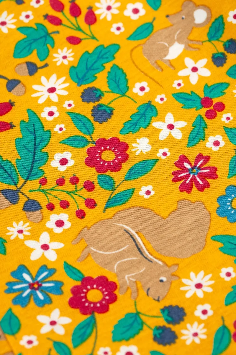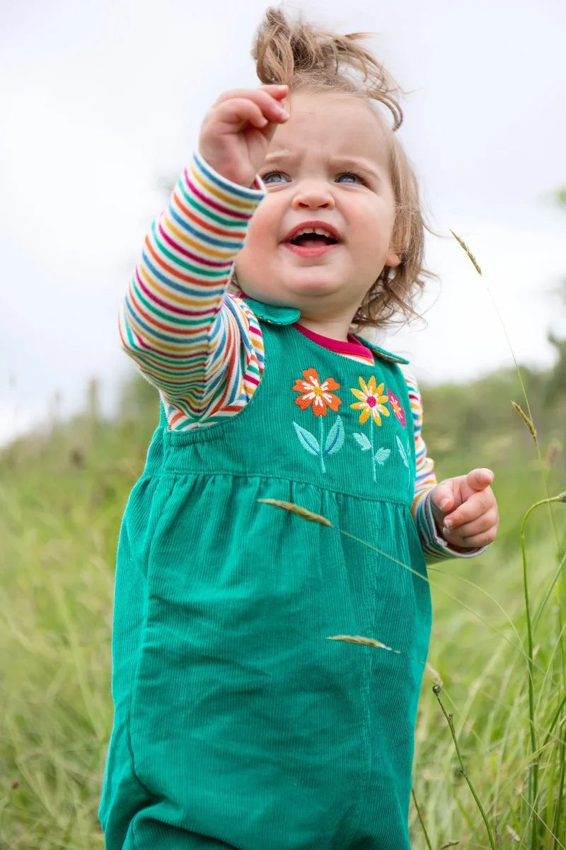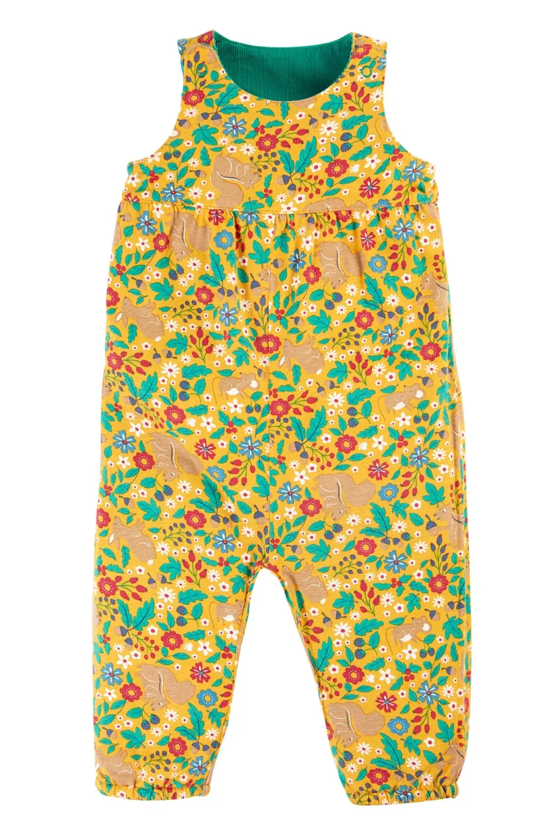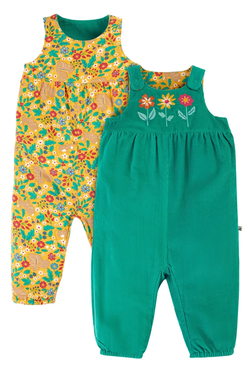 Här får du två par hängselbyxor i ett till ditt barn! Ena sidan i grön manchester med söta blombroderier och vänder man dem ut och in så får man byxor i gul bomullsjersey med ljuvligt blom- och djurmönster. Både tygerna i mjuk och skön ekologisk bomull. Hängselbyxorna är gjorda i en bekväm rymlig modell för komfort och rörelsefrihet.
