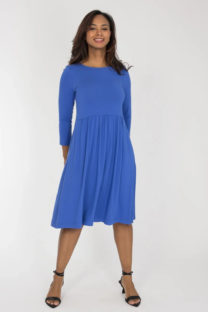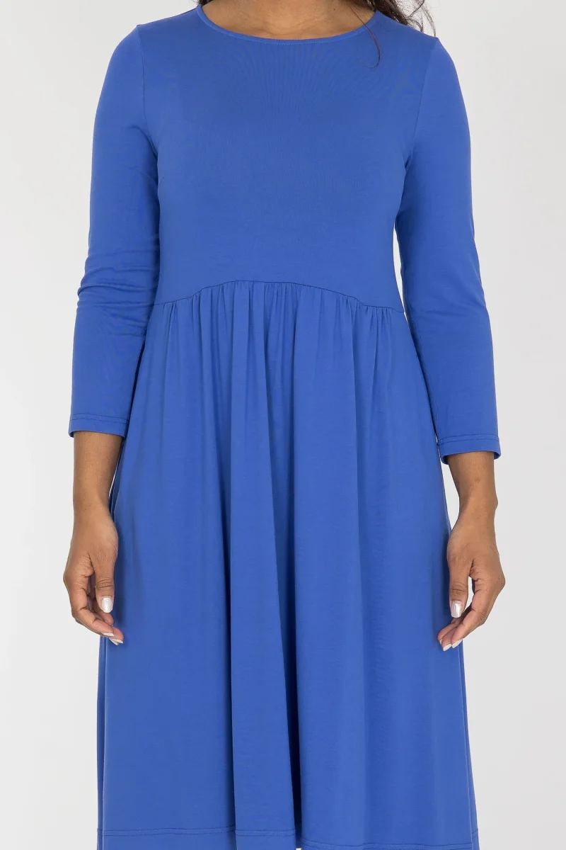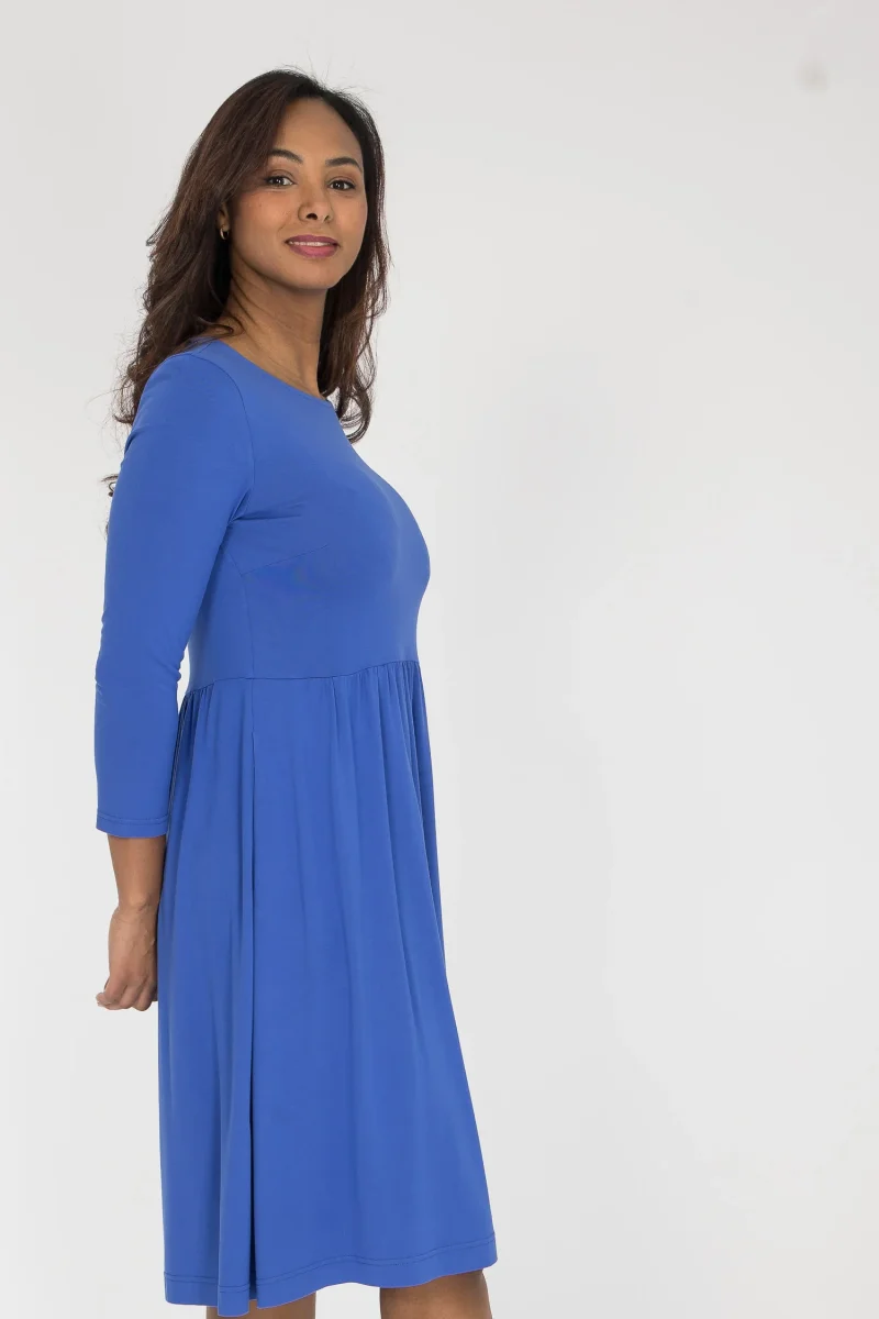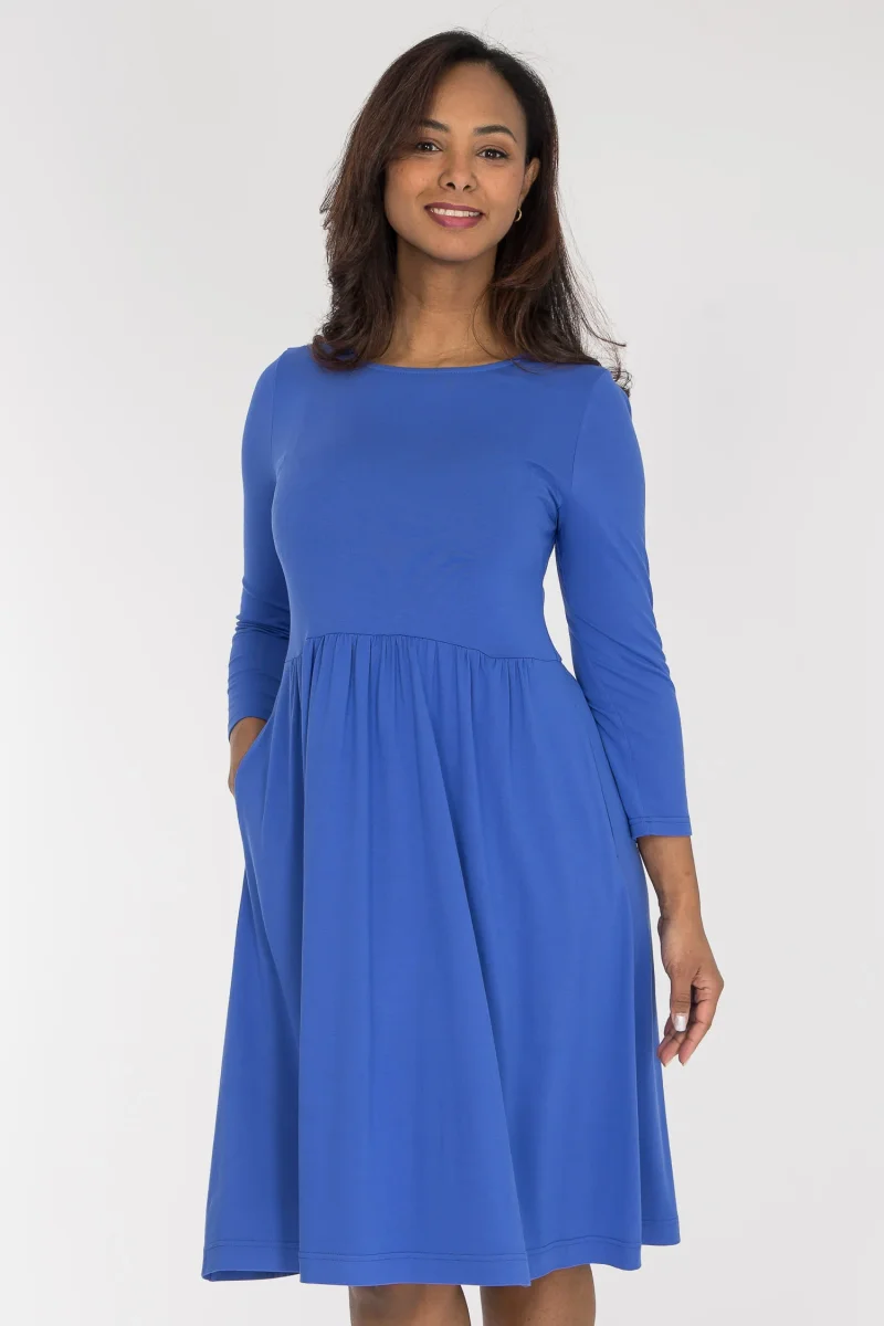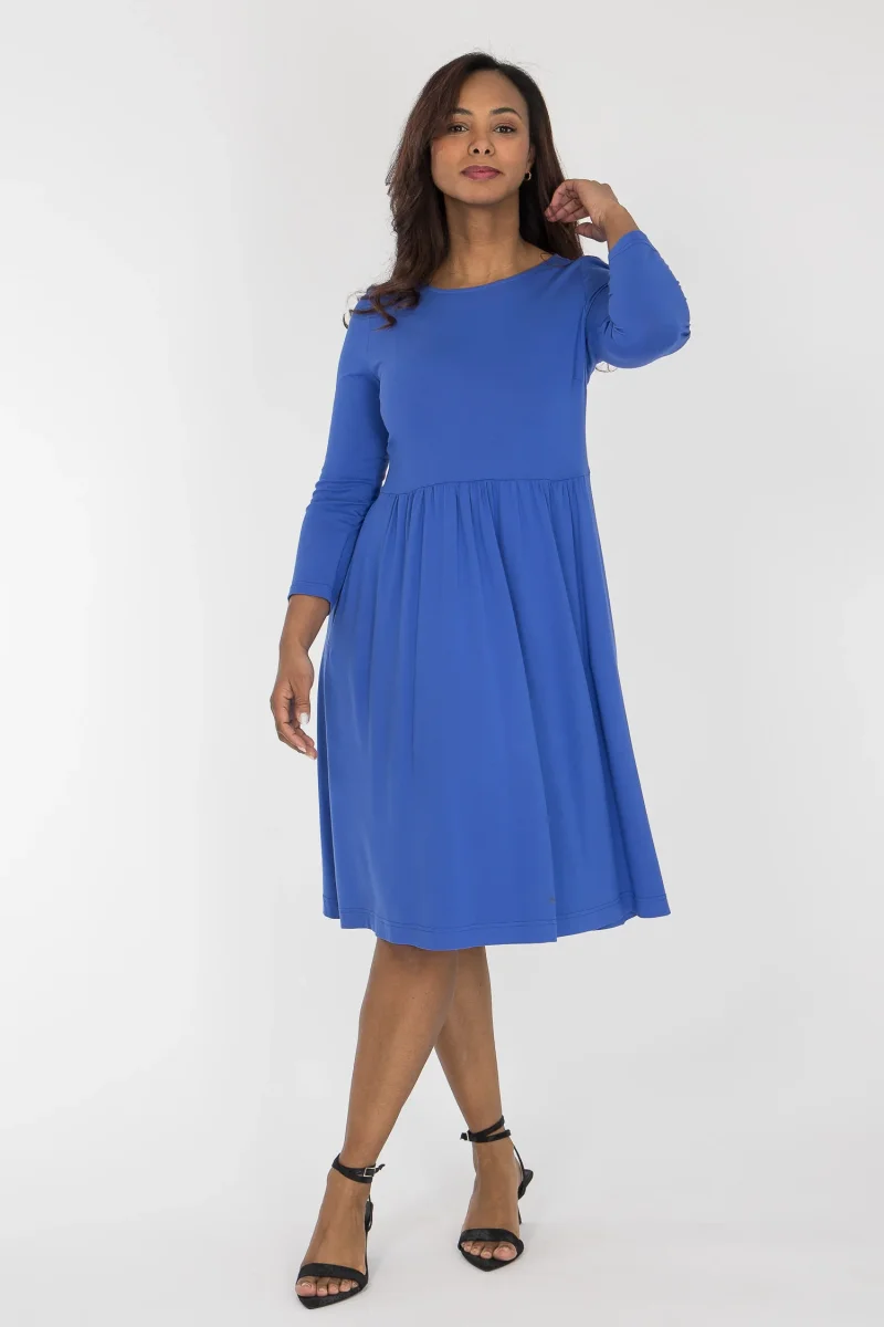Vår omtyckta Ideal dress finns äntligen även i enfärgat, med samma sköna passform. Klänningen är sydd i mjuk viskostrikå med tungt, fint fall. Den är figurnära upptill, med en vidare midja och avskärning ganska högt upp, och en vippig kjol som faller fint runt kroppen. Perfekt när du vill känna dig bekväm men ändå klädd.