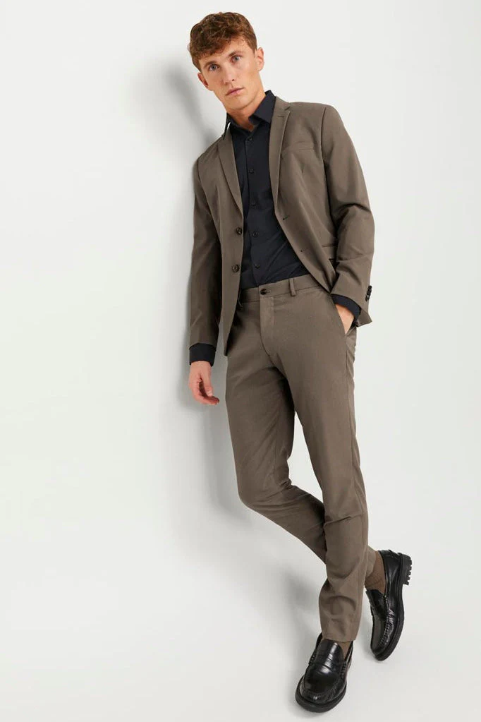 Den här kostymen kännetecknas av en super slim fit som ger en modern och elegant silhuett. Den är tillverkad i ett slitstarkt twilltyg med en distinkt “V” eller “W” vävstruktur, vilket bidrar till ett klassiskt och sofistikerat utseende. Kostymen har lång ärm och en knappstängning, samt en notch-krage som fulländar den formella stilen. Perfekt för tillfällen där klädkoden kräver något extra och stilfullt.