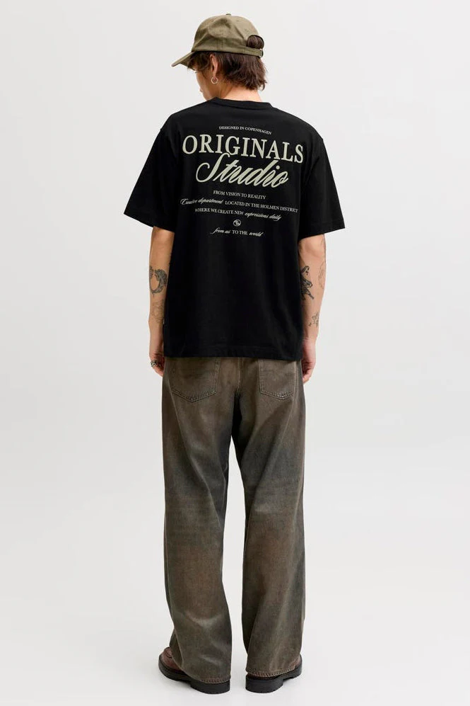 Denna T-shirt har en avslappnad loose fit som gör den bekväm för dagligt bruk. Med korta ärmar och en klassisk rund halsringning är den lätt att matcha med andra plagg. Tyget består av en blandning av bomull, där minst hälften är bomull i omställning direkt från gården, som gradvis blir ekologisk. Materialet är lätt och elastiskt, vilket bidrar till en behaglig känsla under hela dagen. Mönstret är tryckt både fram och bak, vilket ger ett stilfullt och modernt uttryck.