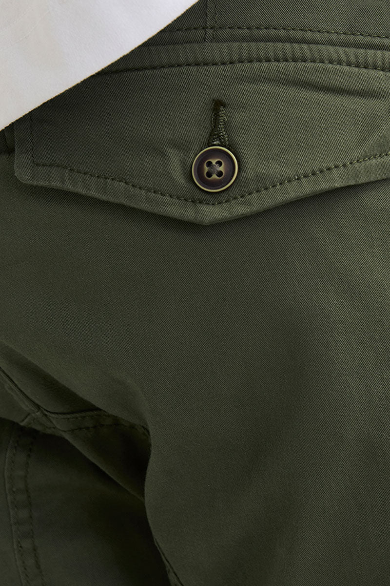 Jack & Jones cargo pants med avsmalnande fit. Kommer i ett bekvämt twill material med stretch. Tyget är behandlad med ett ekologiskt enzymtvätt, som ger denna army grön färg ett slitet look. Utrustad med signaturfickor på låren, två framfickor och två bakfickor. Spänns med blixtlås och toppknapp: Kvalité: 98% bomull, 2% elastan.