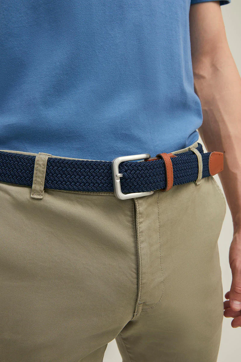 Det flätade bältet är en stabil och stilfull accessoar som passar utmärkt till nästan vilken outfit som helst. Den har en robust känsla tack vare vävningen och stängs med en klassisk nålspänne för enkel justering. Bältet är designat för män och färgen är en mörk blåton som ger en diskret men ändå elegant detalj.