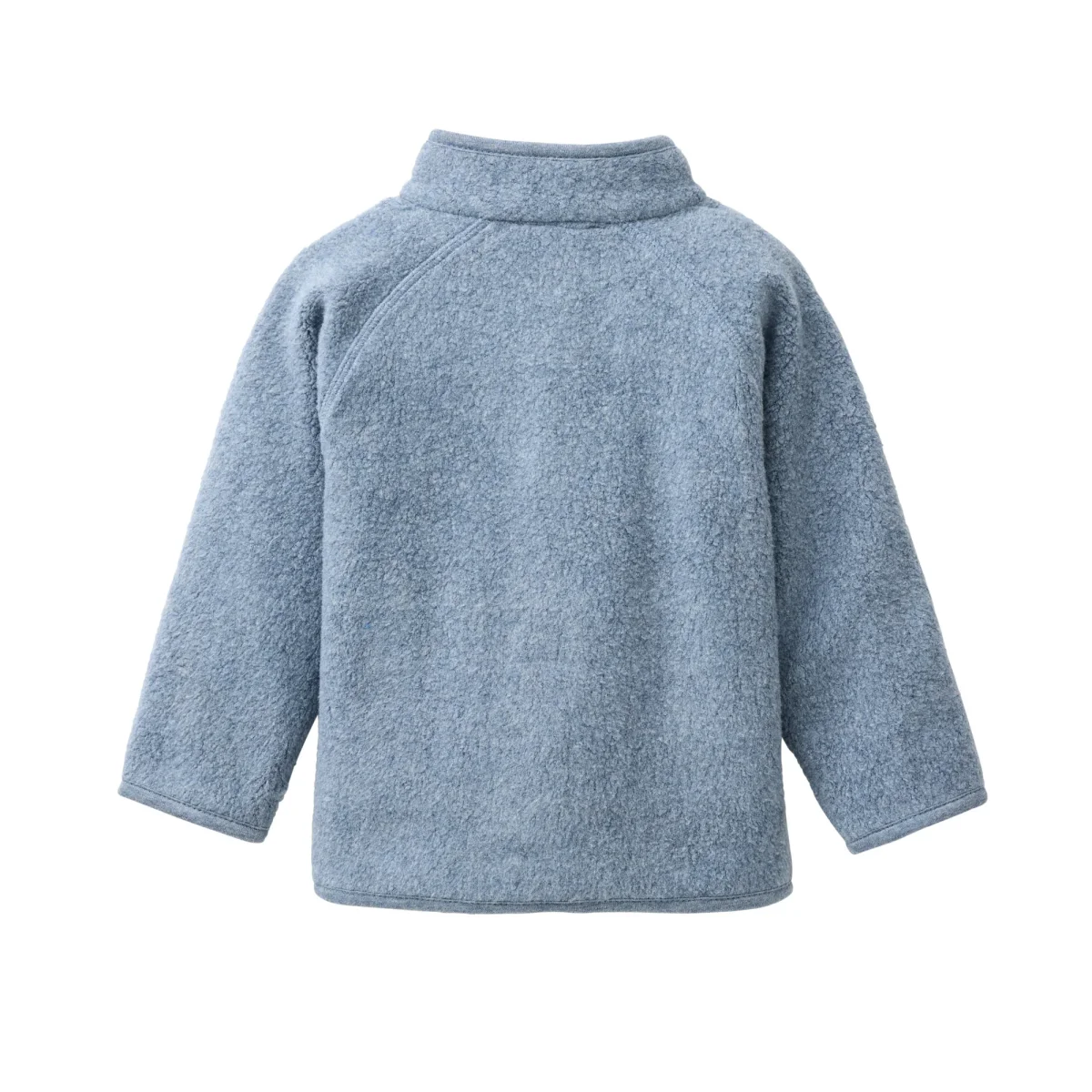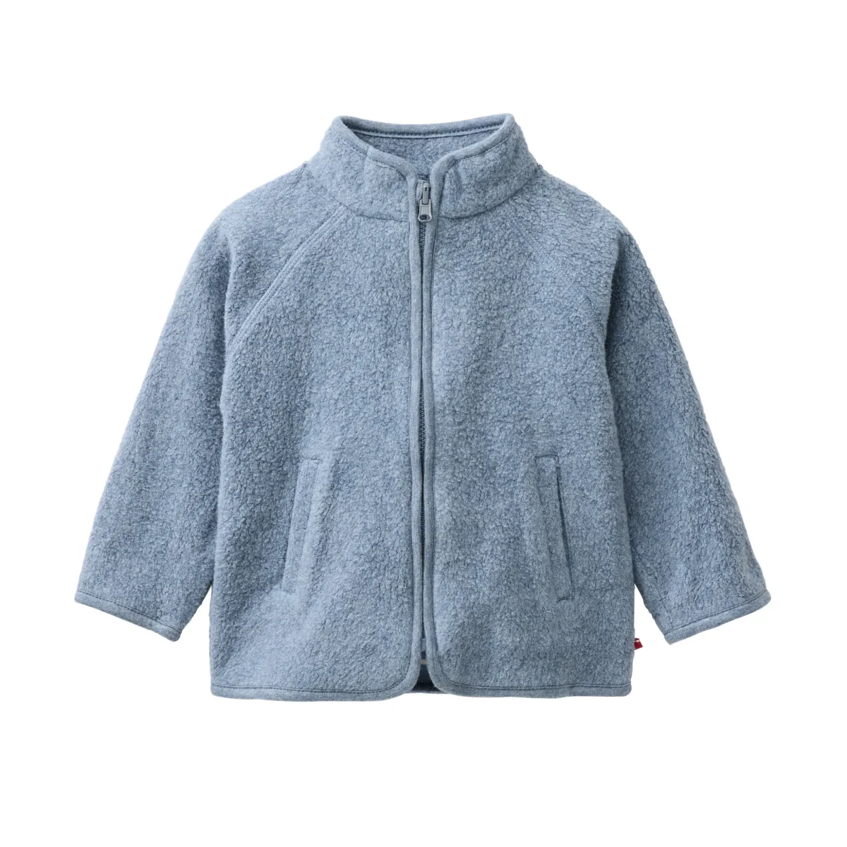 Blågrå fleecejacka för barn i underbart mjuk ekologisk bomullsfleeceblandning. Ett bättre och mer hållbart alternativ än ren syntetfleece. Jackan är helfodrad i blå- och vitrandig ekologisk bomullstrikå, vilket ger den en mycket behaglig känsla. Blixtlås fram och två fickor med blixtlås. Raglanärmar och ståkrage som värmer skönt runt halsen.