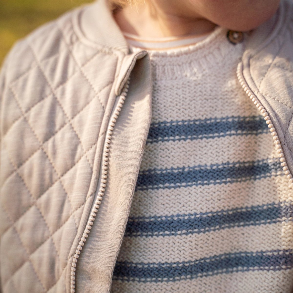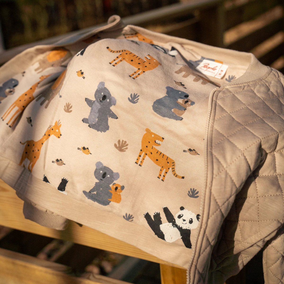 Sandfärgad quiltad jacka för baby och barn i ekologisk bomull. Fodrad med mönstrad bomullstrikå med vilda djur. En både stilfull och mjuk och bekväm jacka för de minsta! Blixtlås fram och två fickor fram.