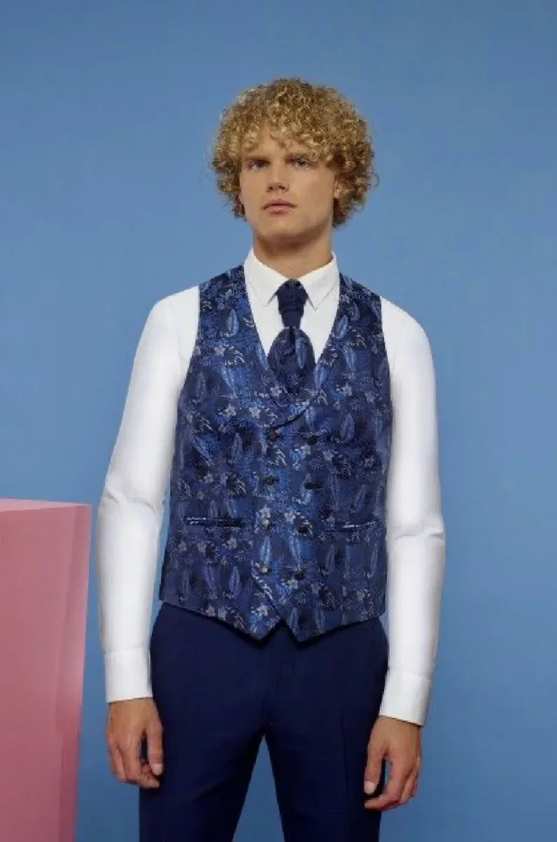 Kavaj med ståkrage, byxa, väst, kravatt och näsduk