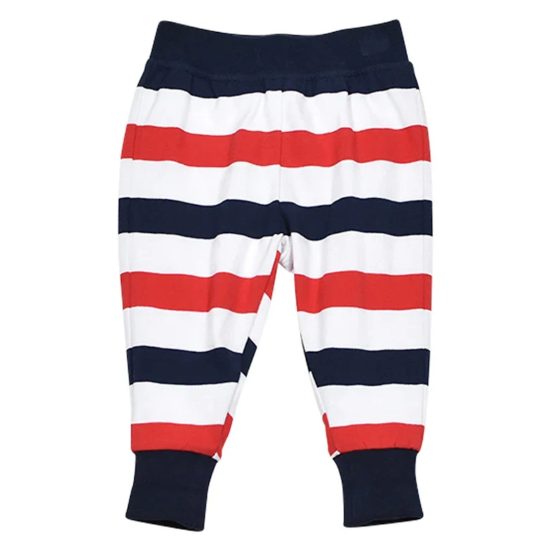Babybyxa i mjuk bekväm passform med avsmalnande ben i en randig design. Byxan har resår med mudd i midja och i benslut och en bakficka på höger sida. Tillverkad i mjuk kvalitet i ekologisk bomull.