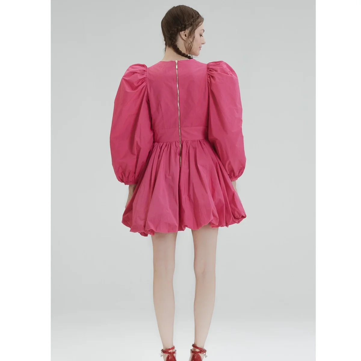 Taftklänning med djup V-ringning och breda puffärmar samt ballongkjol. Mangano maxi charm.