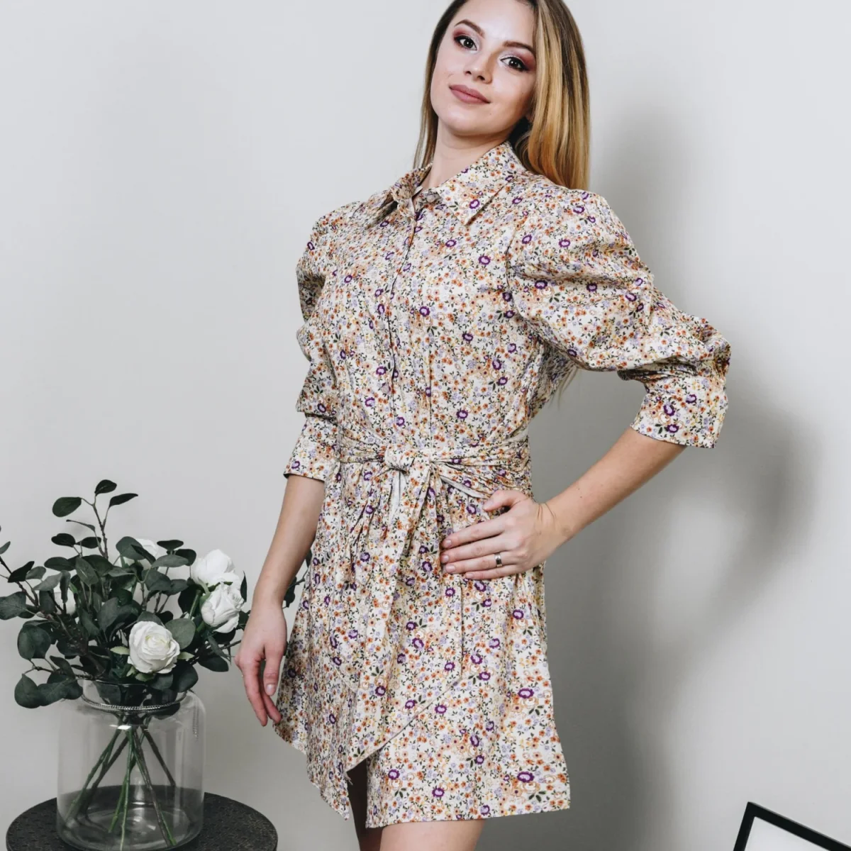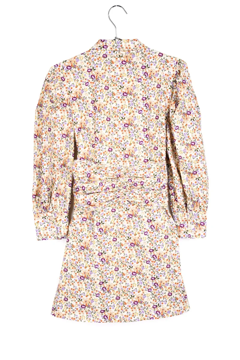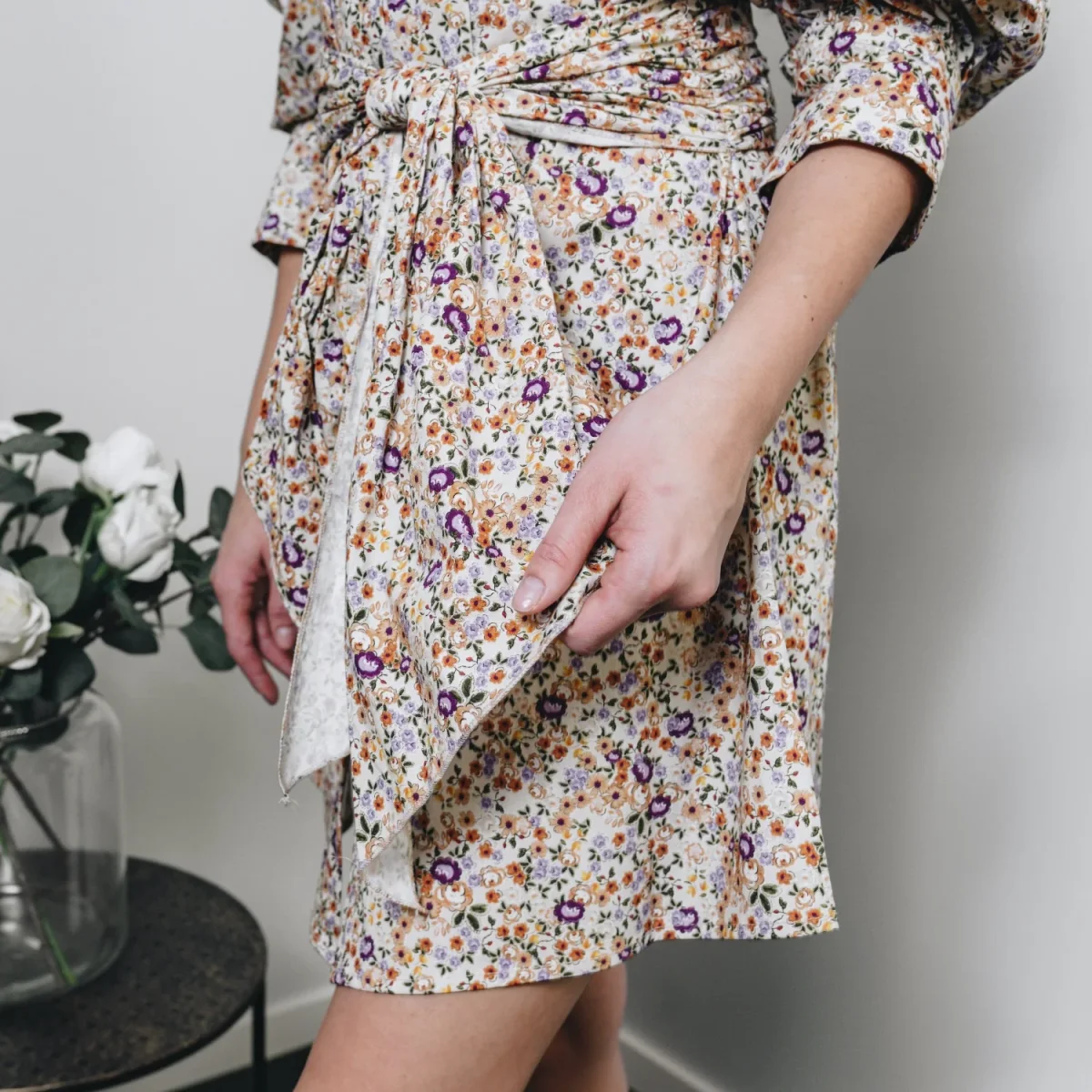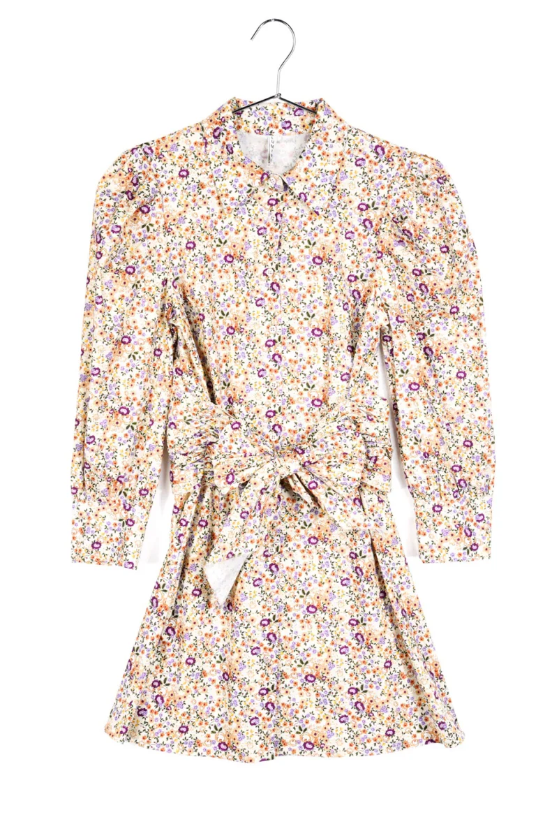 Kort blommig klänning i bomull med knyt runt midja