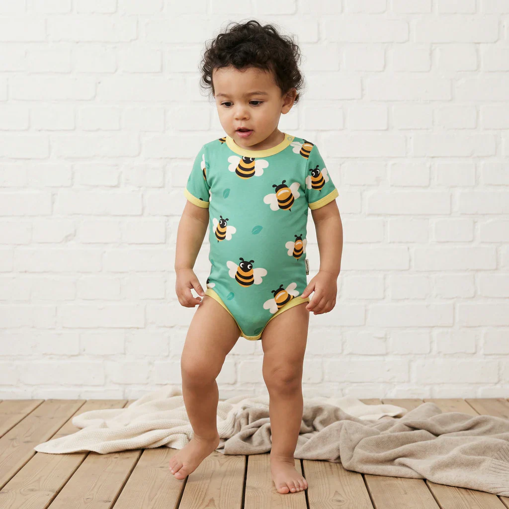 Härligt färgglad body med mönster med bin i mjuk och skön ekologisk bomull. Korta ärmar. Knäppning på ena axeln.