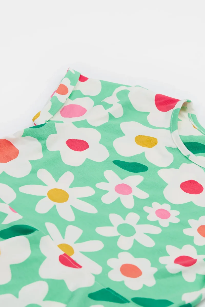 Härlig sommarklänning för barn från Frugi i underbart mjuk och skön ekologisk bomull med fint blomtryck. Korta upprullade ärmar och helcirkelkjol med härlig vidd som är perfekt för att dansa, snurra och leka i! Denna modell kallas ofta just ”snurrklänning”!