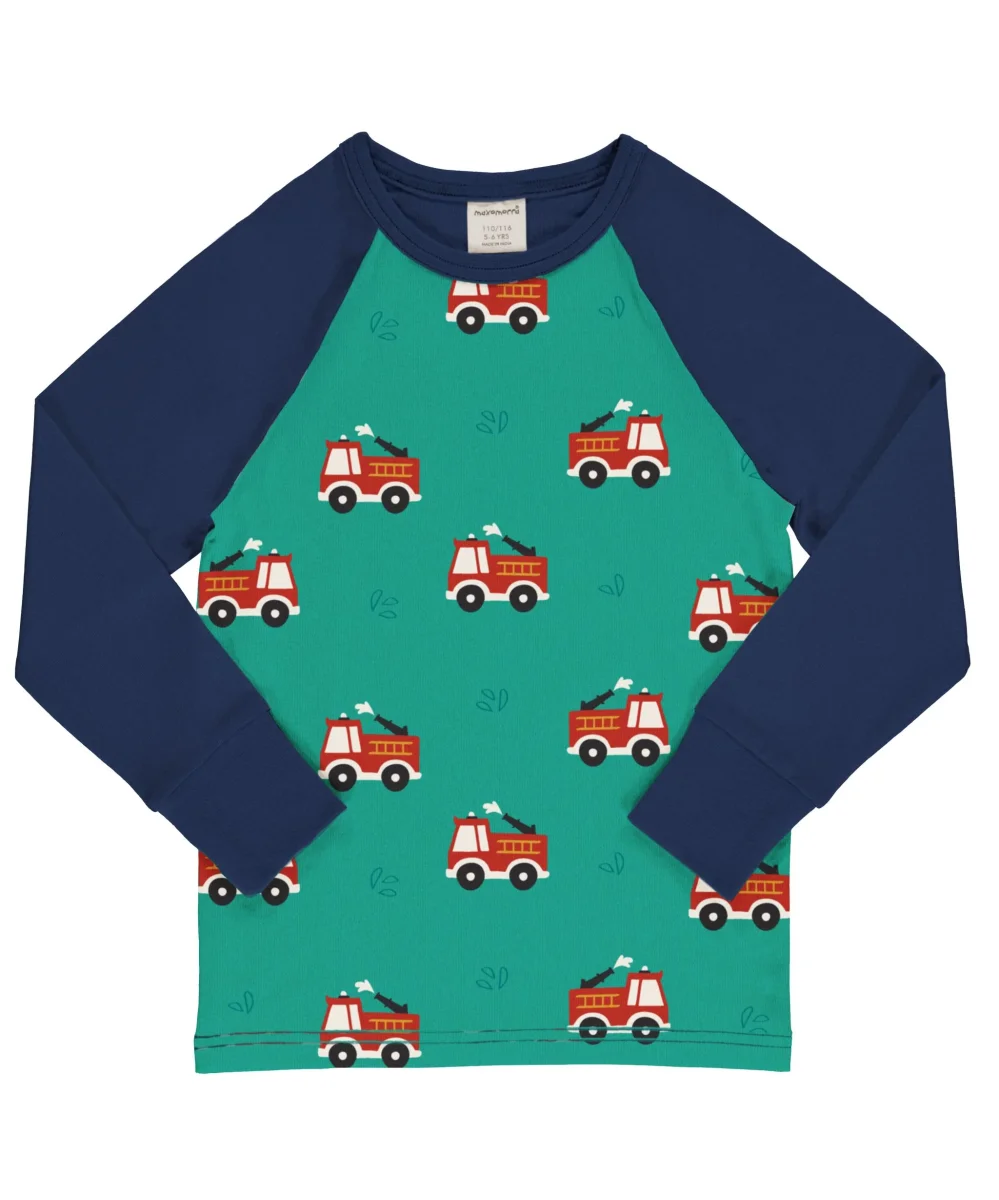 Härligt färgglad långärmad t-shirt i mjuk och skön ekologisk bomull med lekfullt brandbilsmönster. Tröjan har raglanärmar och bakstycke i marinblått.