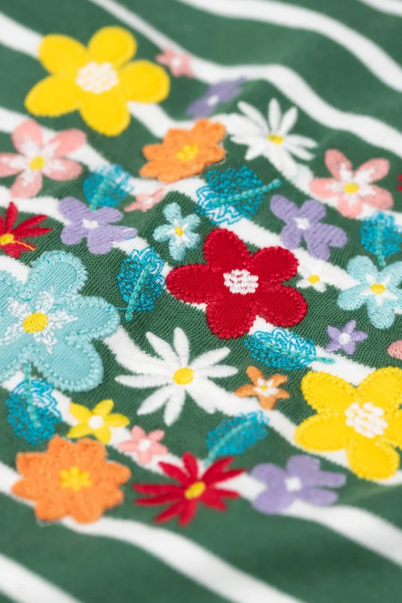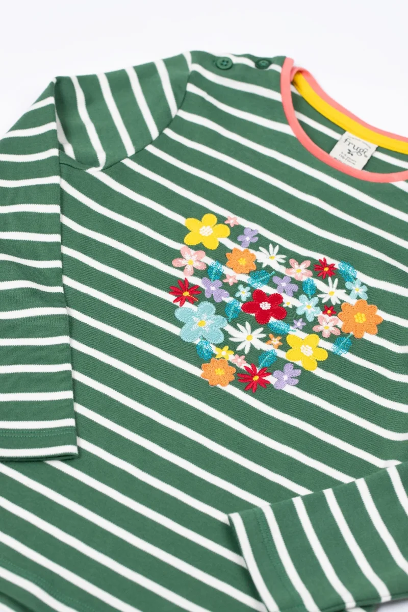 Supermjuk och skön långärmad t-shirt från Frugi i randigt med blomapplikationer som formar ett hjärta! Knappar på axlarna.