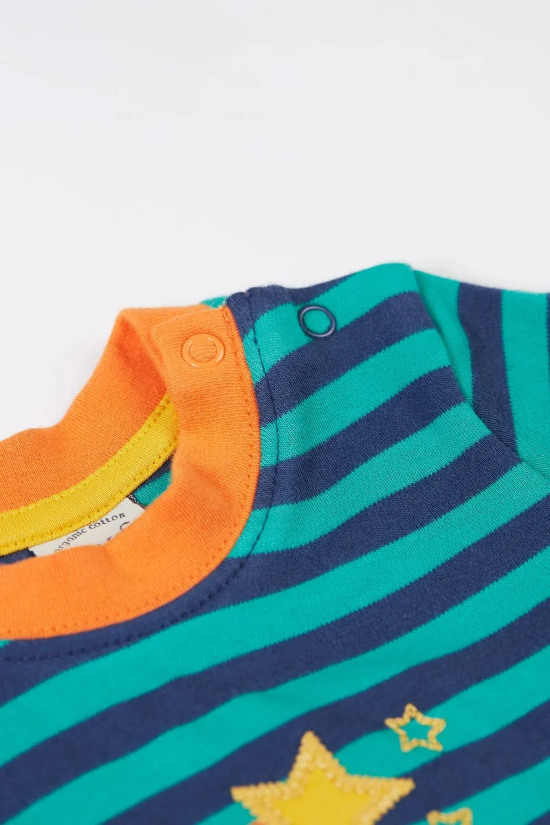 Randig långärmad t-shirt från Frugi i underbart mjuk och skön ekologisk bomullstrikå och applikation framtill med fina isbjörnar. Storlekar upp till 98/104 har tryckknappar på ena axeln för enklare påklädning.
