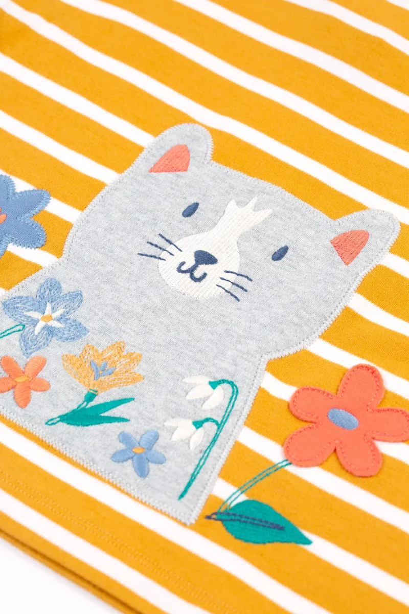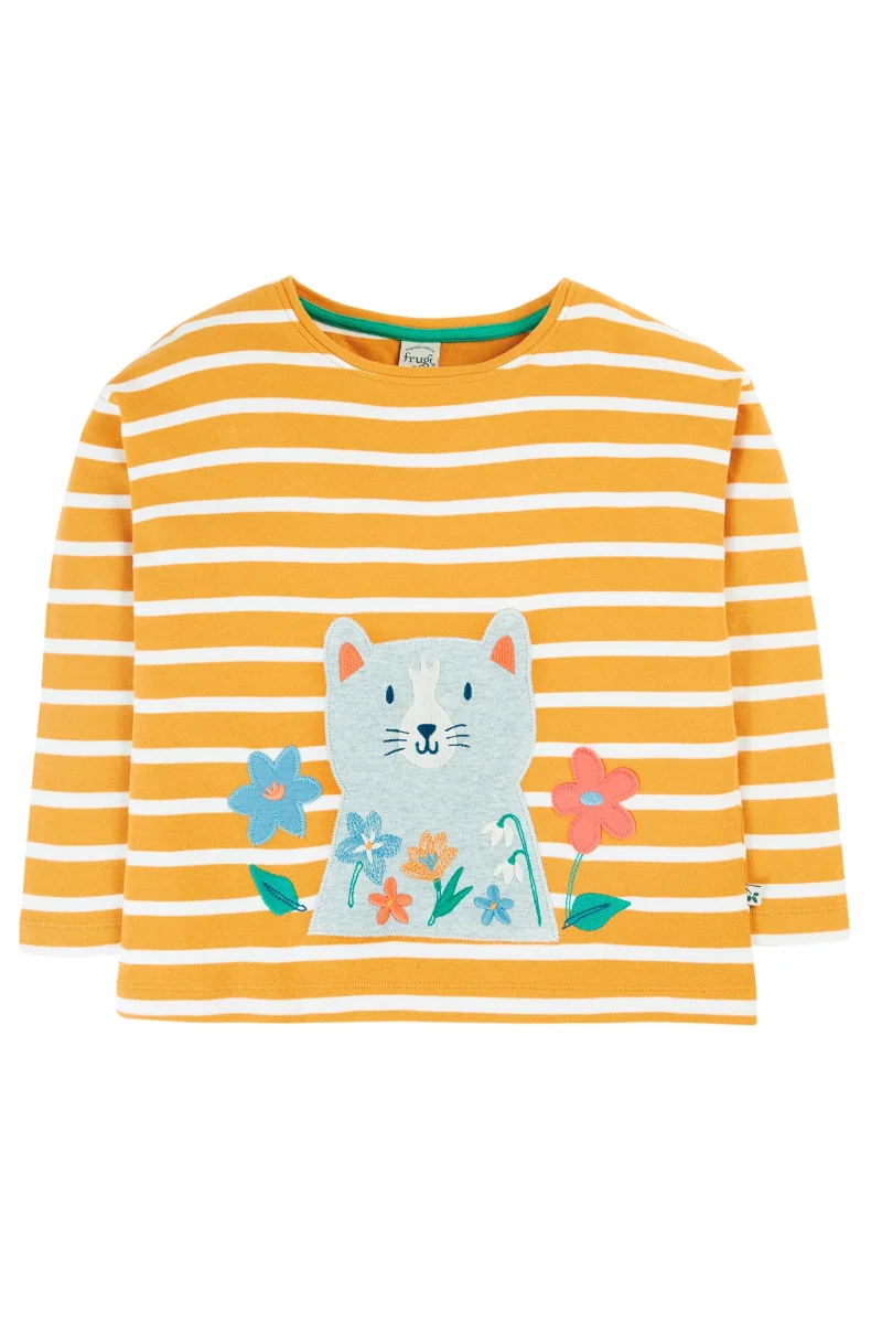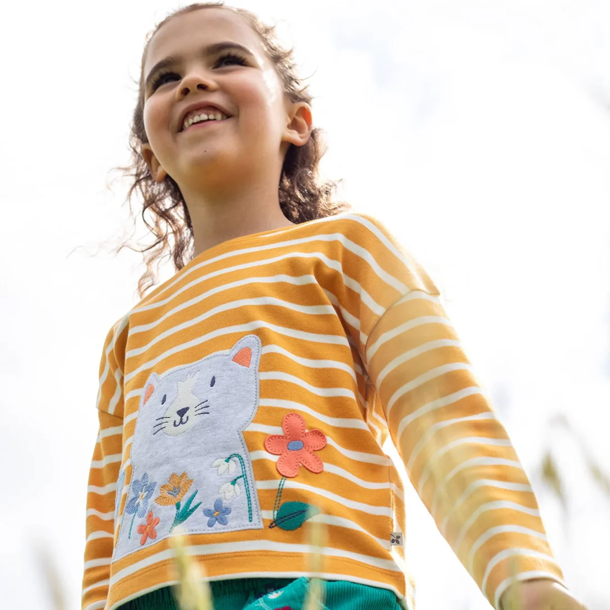 Långärmad randig t-shirt från Frugi med fin kattapplikation. Tröjan har lite nedhasade axlar och sitter lite ledigare än vissa andra av Frugis långärmade tröjor. Storlekar upp till 98/104 har tryckknappar på ena axeln för enklare på- och avklädning.