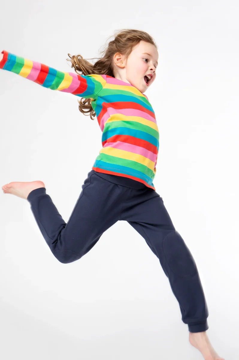 Underbart färgglad långärmad t-shirt från Frugi med ränder i regnbågsfärger i en rosa variant. Tröjan är gjord i mjuk och skön ekologisk bomull.