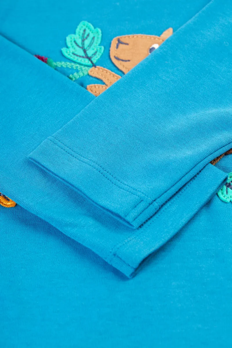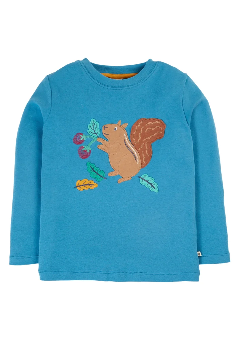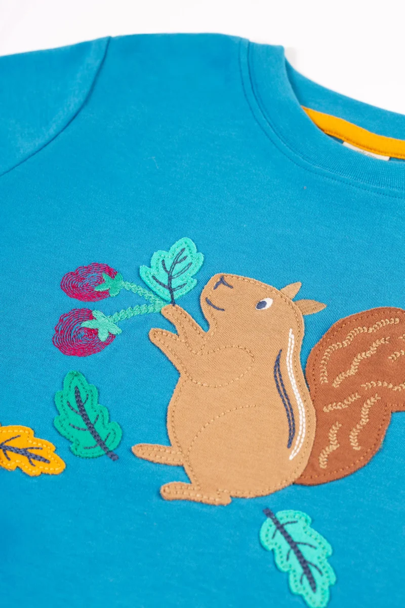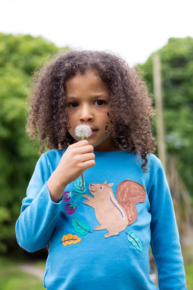 Långärmad t-shirt för barn från Frugi med fin och mycket välsydd applikation i form av en ekorre. Tröjan är gjord i underbart mjuk och skön ekologisk bomull.