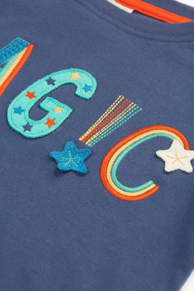 Långärmad t-shirt för barn i Frugis underbart mjuka ekologiska bomullstrikå med applikationer och broderier i form av MAGIC mitt fram. Storlekar upp till 98/104 har tryckknappar på ena axeln.