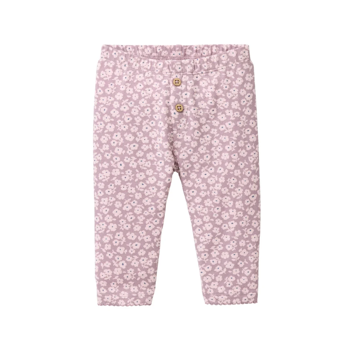 Leggings för baby i småblommig mjuk trikå med två dekorativa knappar framtill och söt uddkant i benslut.
