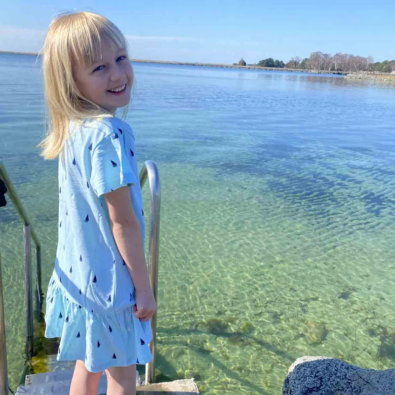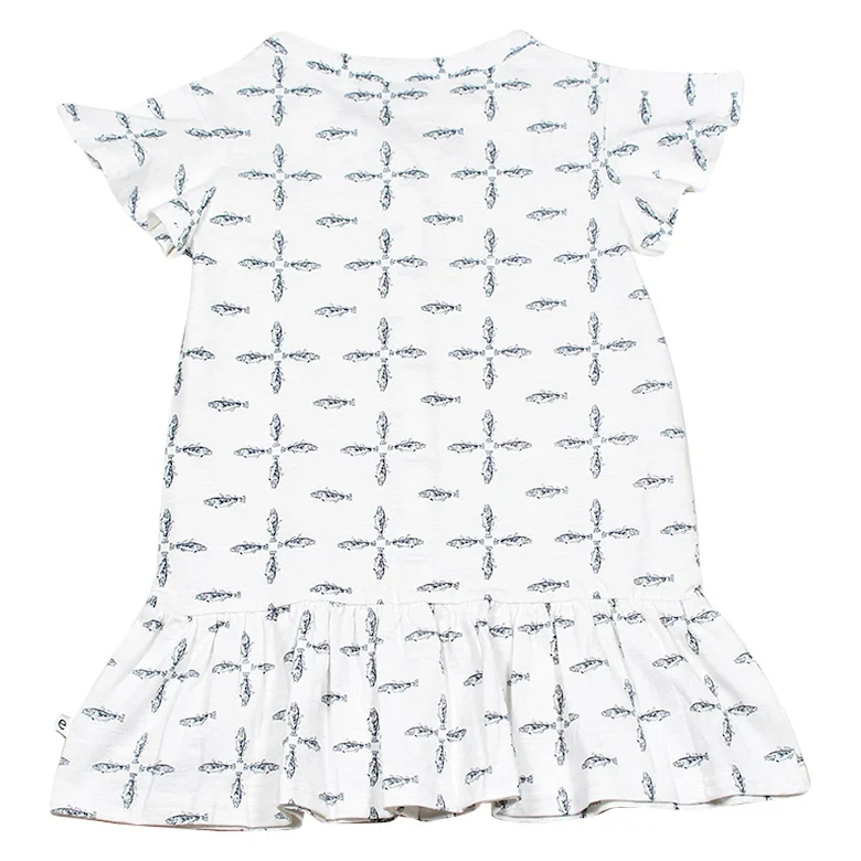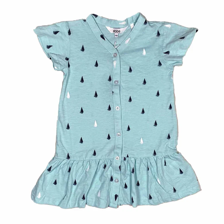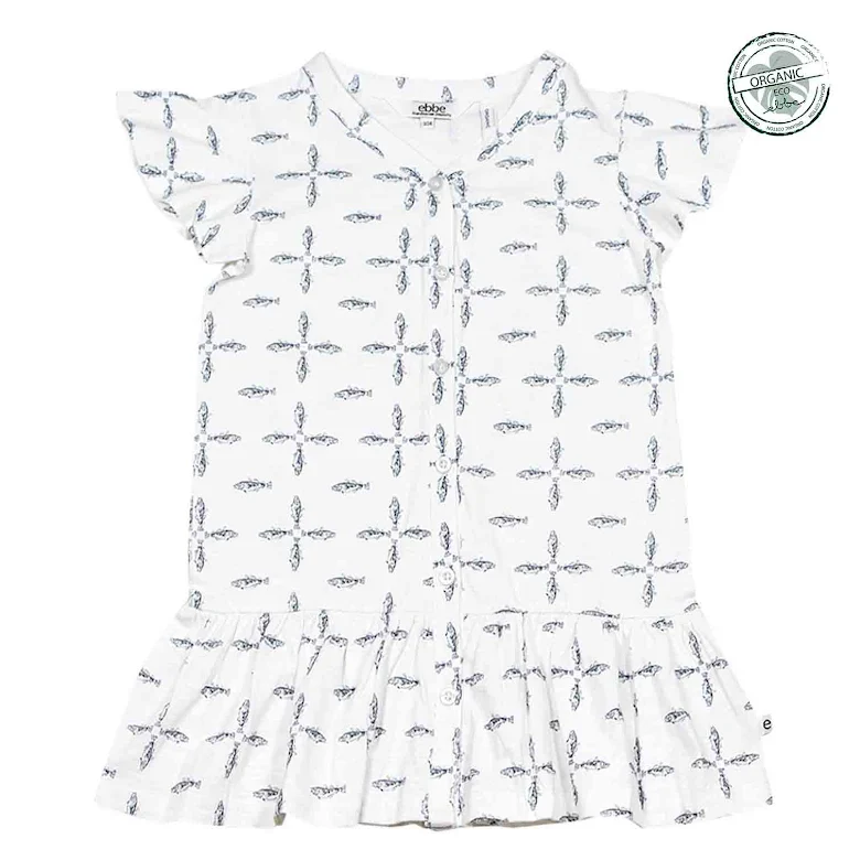 Klänning med fjärilsärm i avslappnad passform tillverkad i mjuk slubtrikå av ekologisk bomull. Klänningen har en snygg V-ringning i halsen och knäppkant fram med både funktionella och dekorativa knappar. Korta volangärmar och skärning vid höften med en volang nederdel. Den perfekta sommarklänningen, tunn, skön och snäll mot barnets hud.