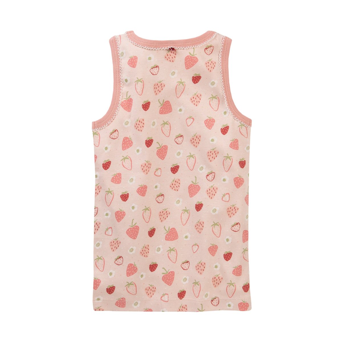 Linne för barn i 100 % ekologisk bomullstrikå med sött jordgubbsmönster. Liten dekorativ uddkant runt armhål och halsringning.