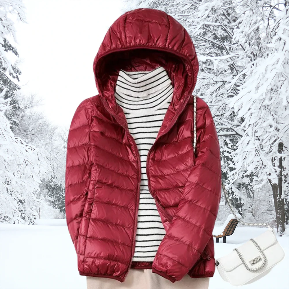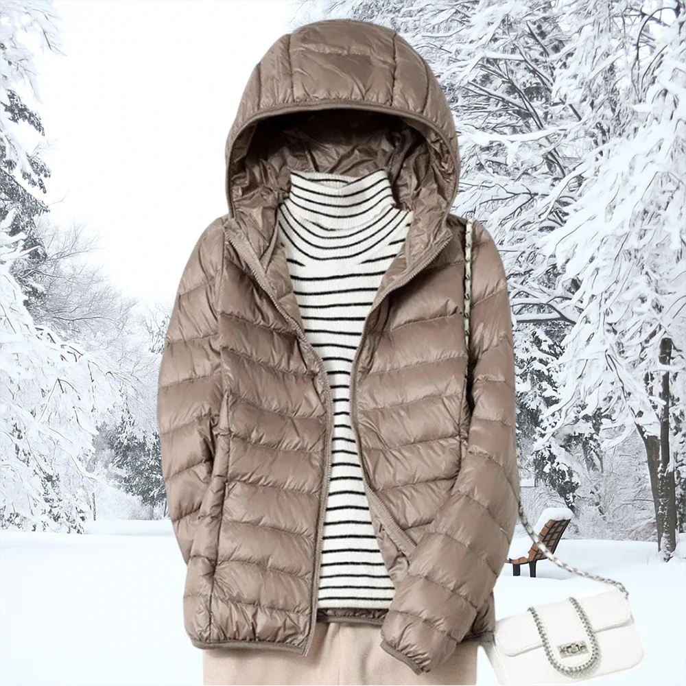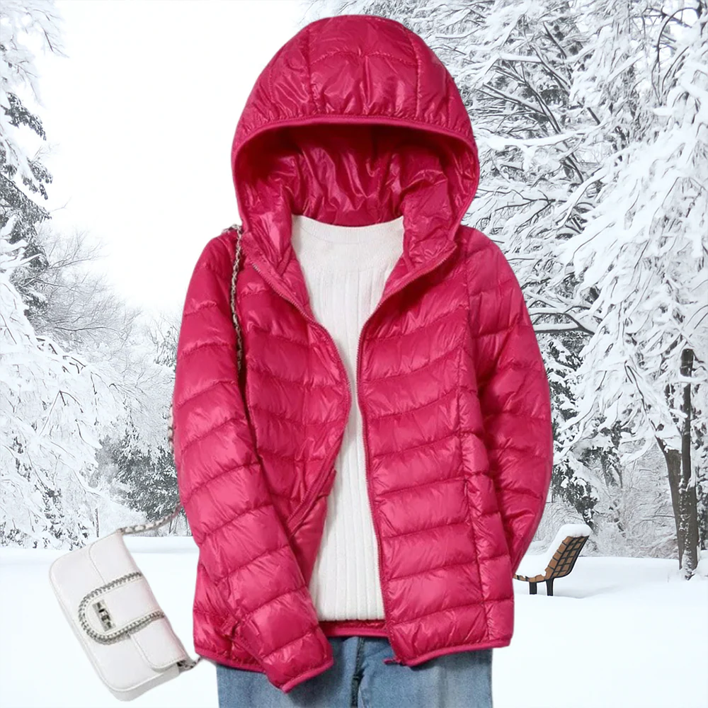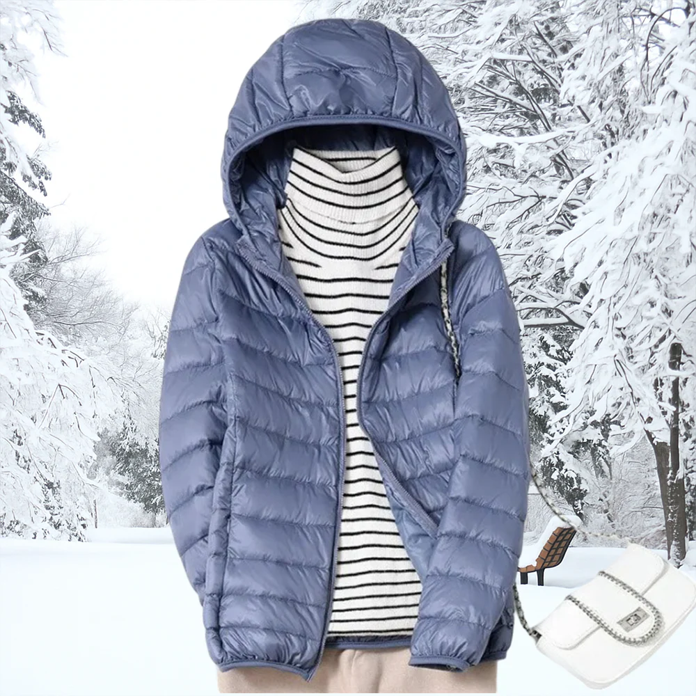 Upplev komfort och elegans med Malinor, en tjock, smal jacka fylld med 80% vit ankdun som håller dig varm under kyliga höst- och vinterdagar. Med huva, dragkedja och ett elegant, enfärgat snitt kombinerar den funktionalitet med tidlös stil, perfekt för både kontoret och vardagliga promenader.