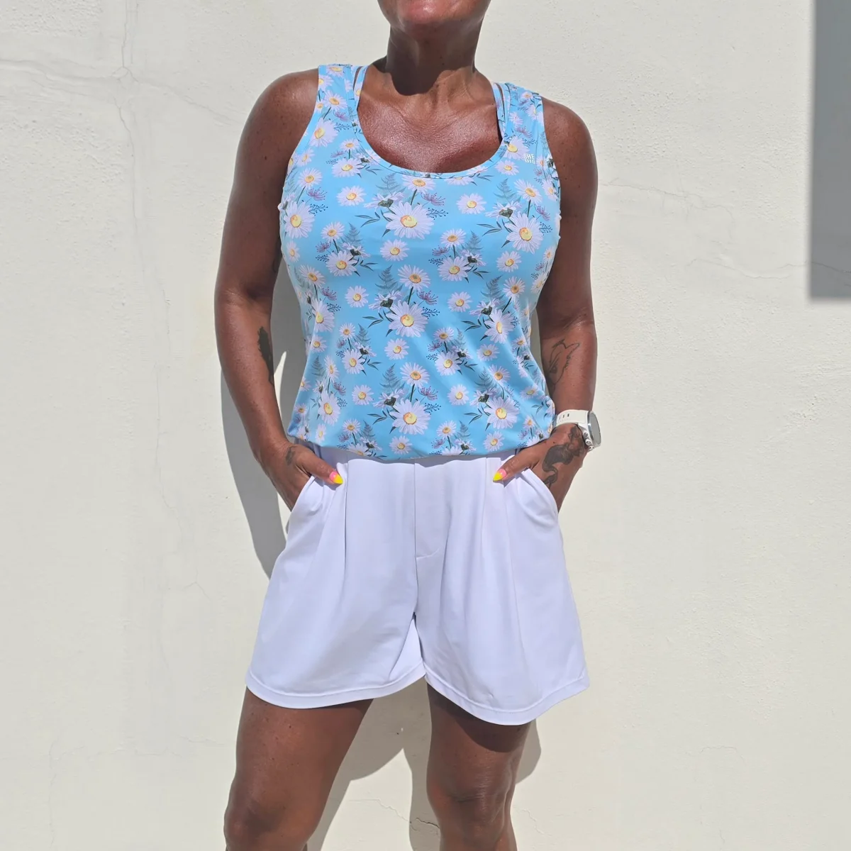 Snyggt linne i blommigt mönster med rundad hals. Linnet passar lika bra till vardags, som på gymmet, golfbanan och i padelhallen. Väldigt snyggt under kavaj.