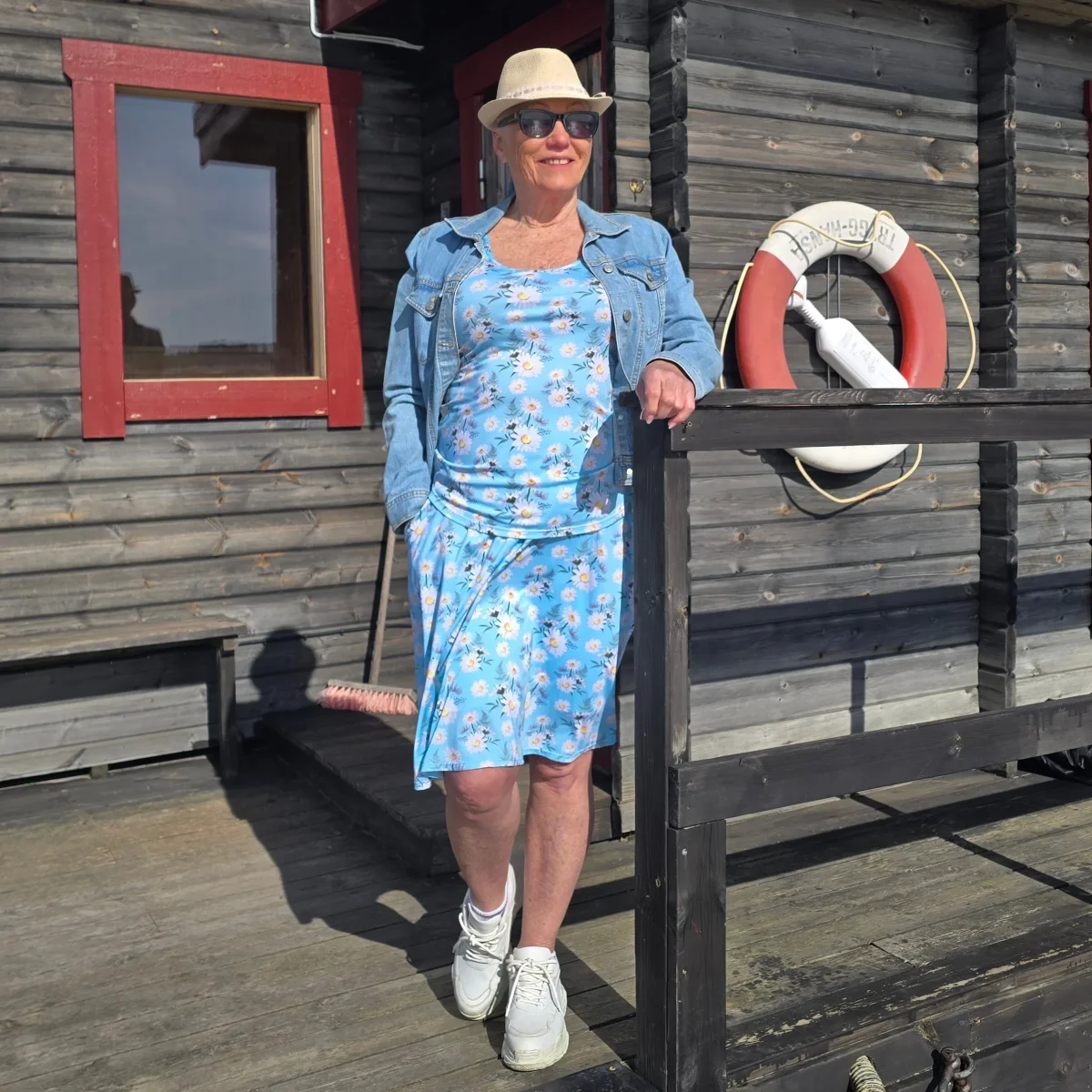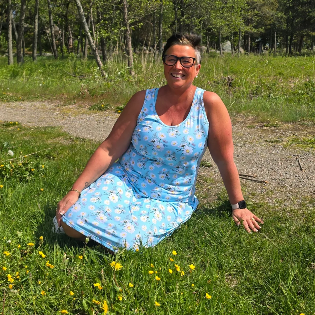 Modellen är som sitter i gräset är 170 cm lång och bär storlek XL. De övriga modeellerna är 174 och 167 cm lång och bär storlek L.